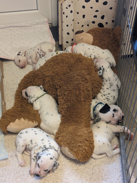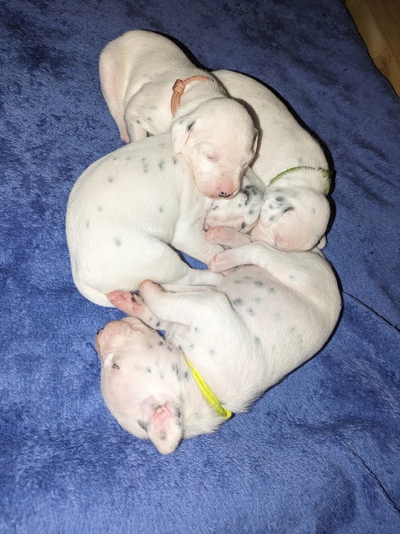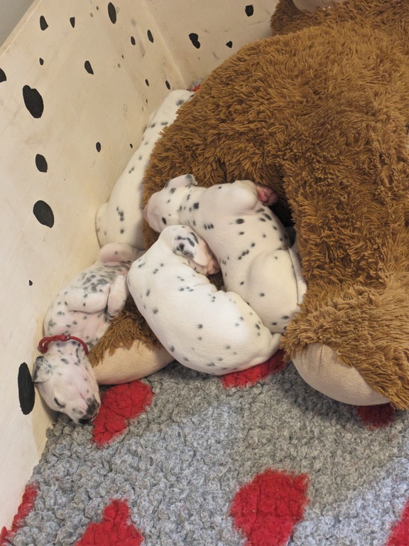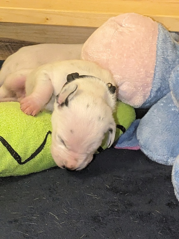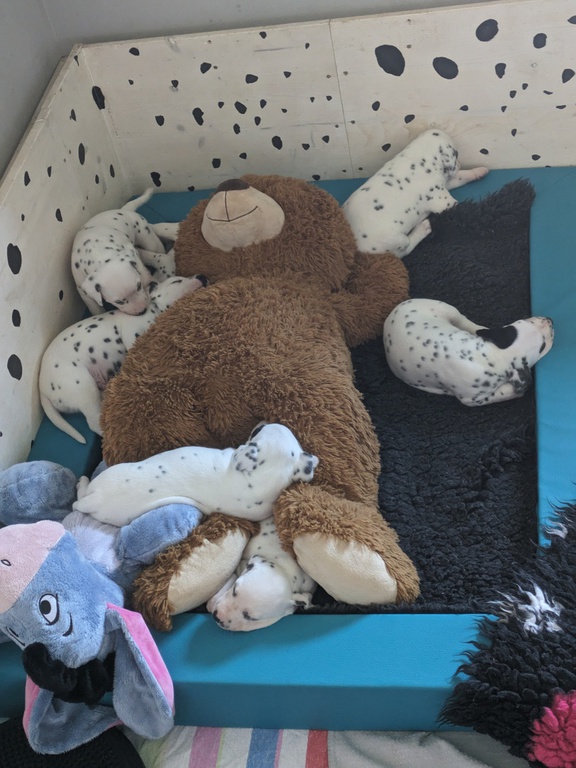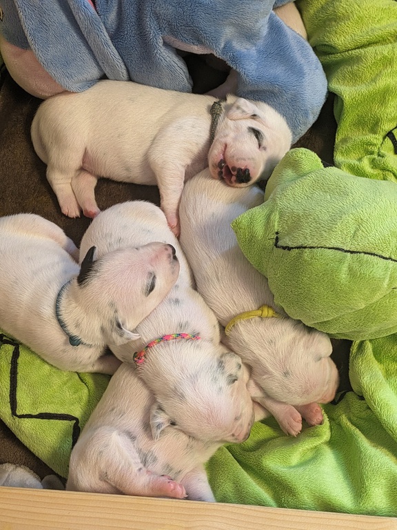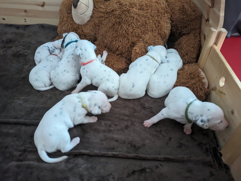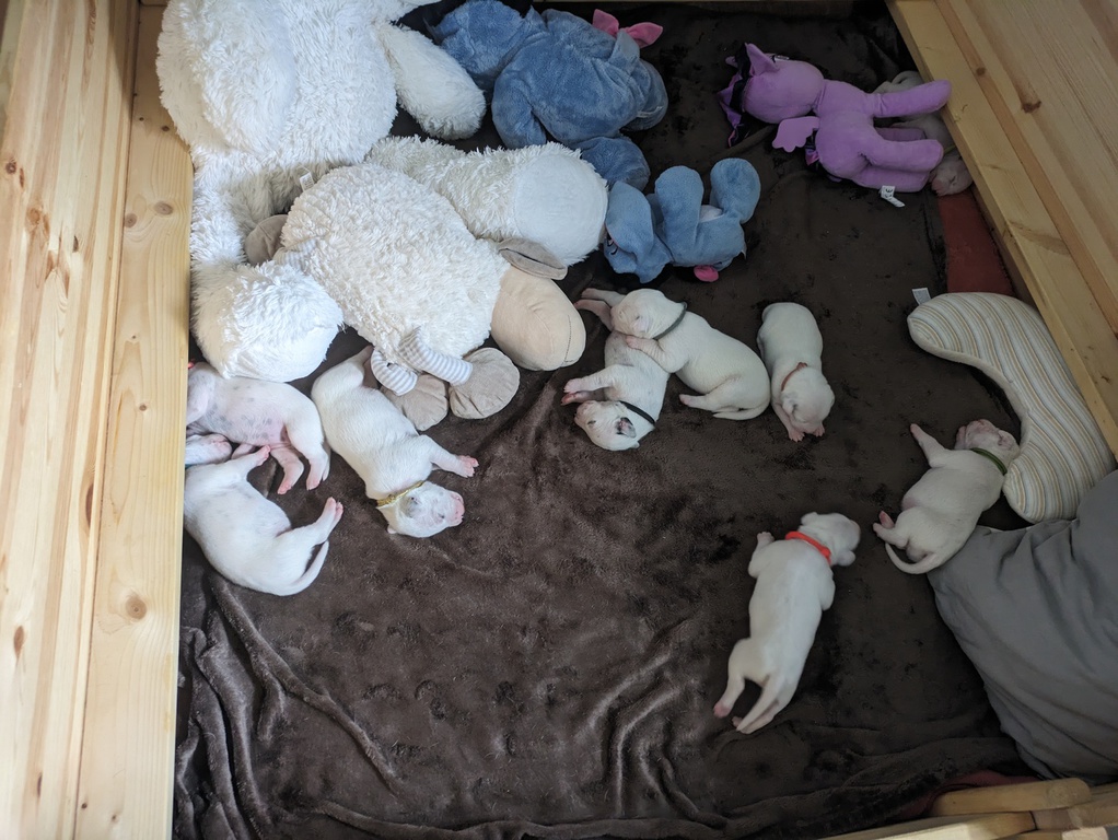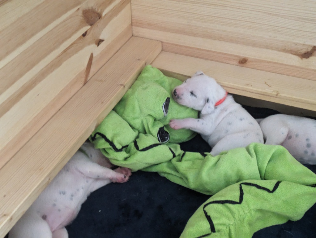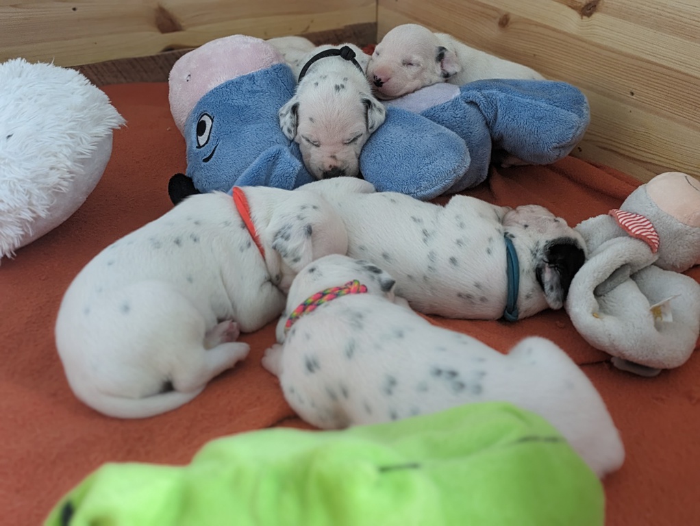 Die Pünktchen Bande nimmt gut zu, damit sind wir völlig zufrieden. Die Schlafensphansen sind auch schon etwas länger, jedoch ist dann richtig Party wenn alle wach sind und an die Milchbar wollen. Die ersten Äuglein sind schon auf. Herr Schwarz war hier der Erste, er ist insgesamt relativ flott, auch beim laufen und erkunden. Frau Gelb, Frau Oliv, Frau Orange und Herr Petrol haben ebenfalls die Augen offen. Die restlichen 5 lassen sich noch etwas Zeit damit, sie wollen wohl noch nicht die Welt sehen. Trotzdem sind sie alle schon recht gut auf ihren Beinchen unterwegs und die ganze Wurfbox wird erkundet. Ist mal kein Spielzeug in der Box, so finden sie das überhaupt nicht gut, schließlich wollen sie auf die Kuscheltiere drauf klettern oder sich darunter verstecken zum schlafen. Zur Not müssen halt die Geschwister her halten und werden als Kopfkissen benutzt. Es wird auch schon fleißig am Geschwisterchen herum gekanabbert und auch an Mama Ami. Es wird sich schon hingesetzt wie ein Großer und auch die Bellversuche werden immer besser. Das Körbchen reicht nun auch nicht mehr aus und so sind wir auf eine Faltbox umgestiegen, dies fanden sie am ersten Tag allerdings nicht so lustig und Herr Petrol hat dies auch laut verkündet und fleißig gebellt. Dies hört sich natürlich aktuell alles noch sehr lustig an. Nach kurzer Zeit, fanden es aber alle in Ordnung und haben sich friedlich ineinander gekuschelt und geschlafen. Auch der Distanzrahmen ist abgekommen, denn da passen sie nicht mehr drunter und so ist gefühlt auch etwas mehr Platz in der Box.