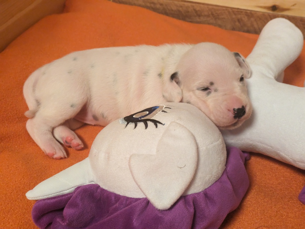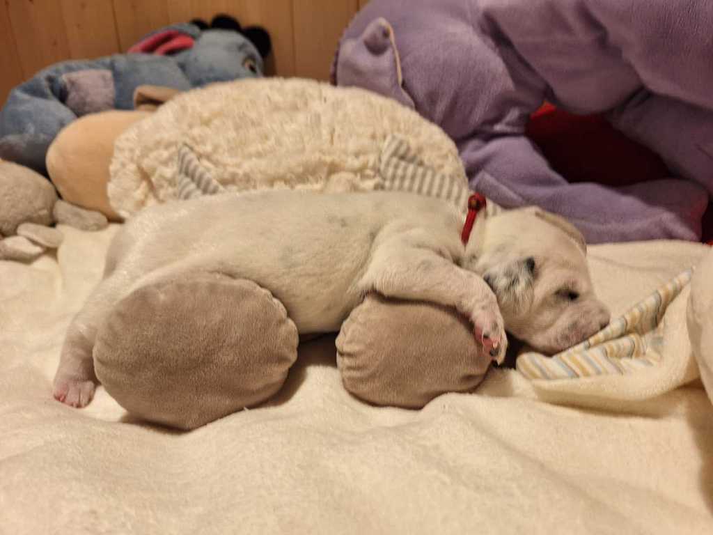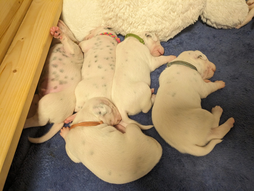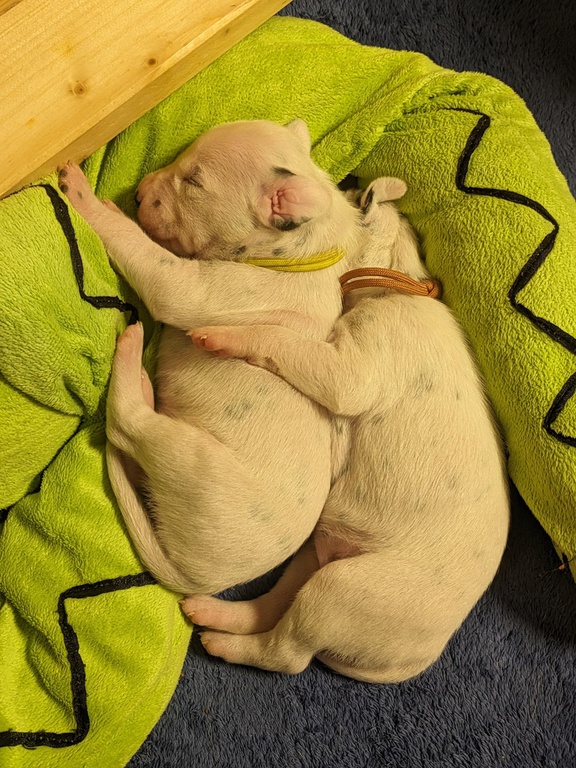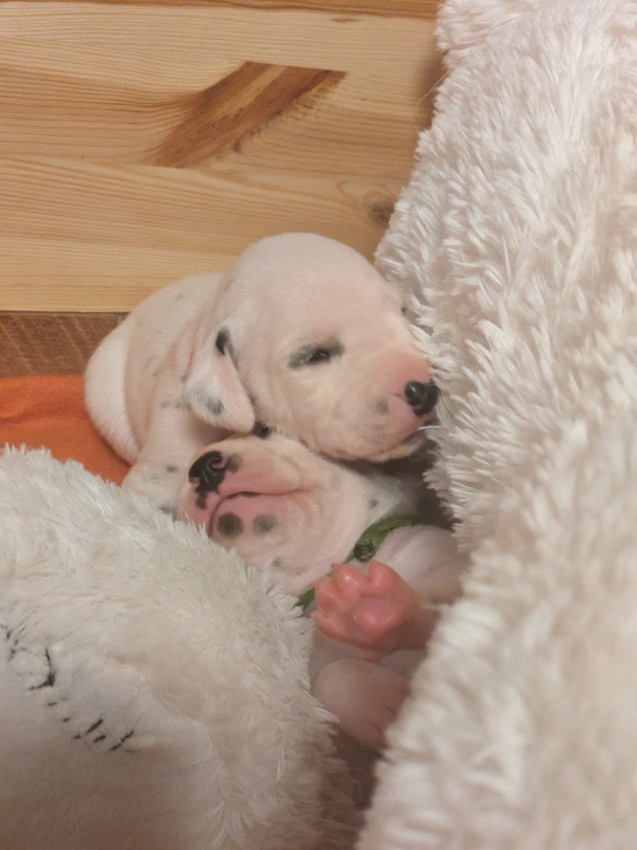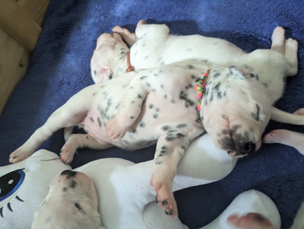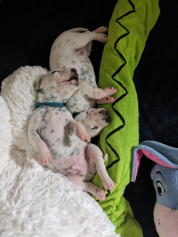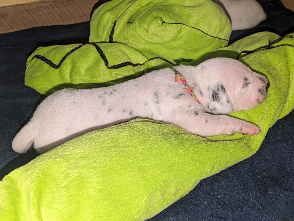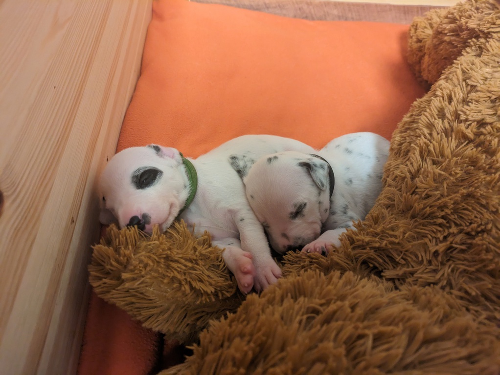 Die Pünktchen Bande nimmt gut zu, damit sind wir völlig zufrieden. Die Schlafensphansen sind auch schon etwas länger, jedoch ist dann richtig Party wenn alle wach sind und an die Milchbar wollen. Die ersten Äuglein sind schon auf. Herr Schwarz war hier der Erste, er ist insgesamt relativ flott, auch beim laufen und erkunden. Frau Gelb, Frau Oliv, Frau Orange und Herr Petrol haben ebenfalls die Augen offen. Die restlichen 5 lassen sich noch etwas Zeit damit, sie wollen wohl noch nicht die Welt sehen. Trotzdem sind sie alle schon recht gut auf ihren Beinchen unterwegs und die ganze Wurfbox wird erkundet. Ist mal kein Spielzeug in der Box, so finden sie das überhaupt nicht gut, schließlich wollen sie auf die Kuscheltiere drauf klettern oder sich darunter verstecken zum schlafen. Zur Not müssen halt die Geschwister her halten und werden als Kopfkissen benutzt. Es wird auch schon fleißig am Geschwisterchen herum gekanabbert und auch an Mama Ami. Es wird sich schon hingesetzt wie ein Großer und auch die Bellversuche werden immer besser. Das Körbchen reicht nun auch nicht mehr aus und so sind wir auf eine Faltbox umgestiegen, dies fanden sie am ersten Tag allerdings nicht so lustig und Herr Petrol hat dies auch laut verkündet und fleißig gebellt. Dies hört sich natürlich aktuell alles noch sehr lustig an. Nach kurzer Zeit, fanden es aber alle in Ordnung und haben sich friedlich ineinander gekuschelt und geschlafen. Auch der Distanzrahmen ist abgekommen, denn da passen sie nicht mehr drunter und so ist gefühlt auch etwas mehr Platz in der Box.
