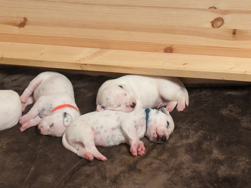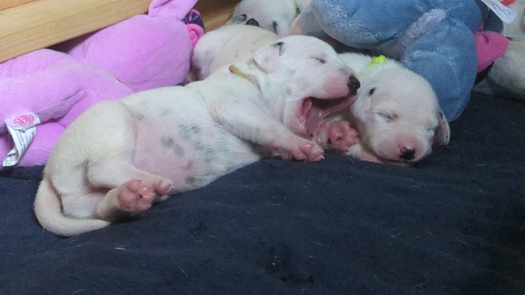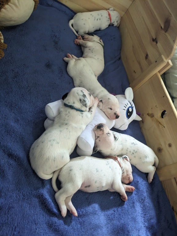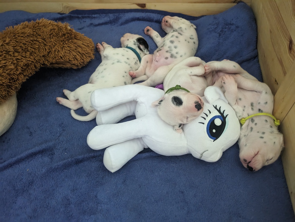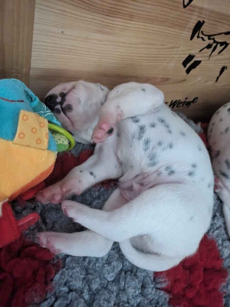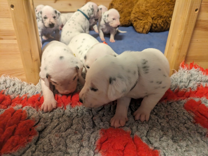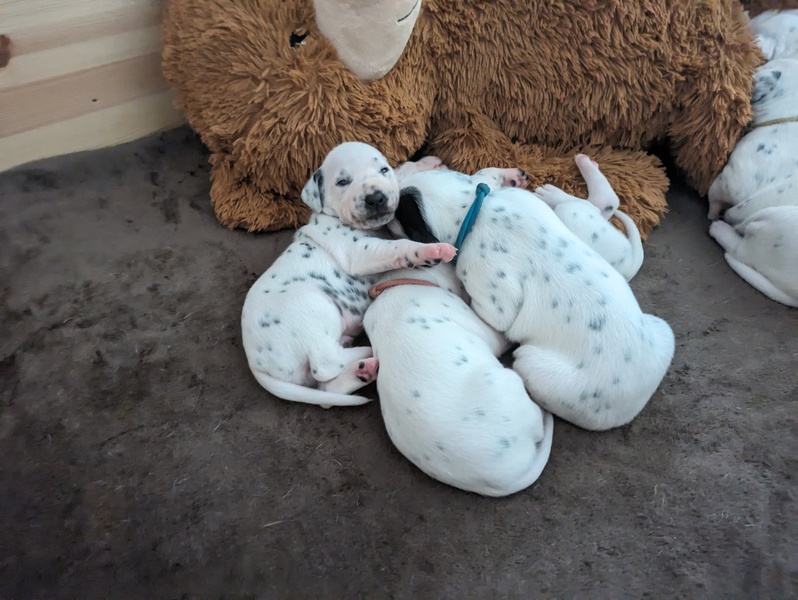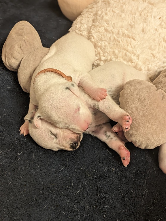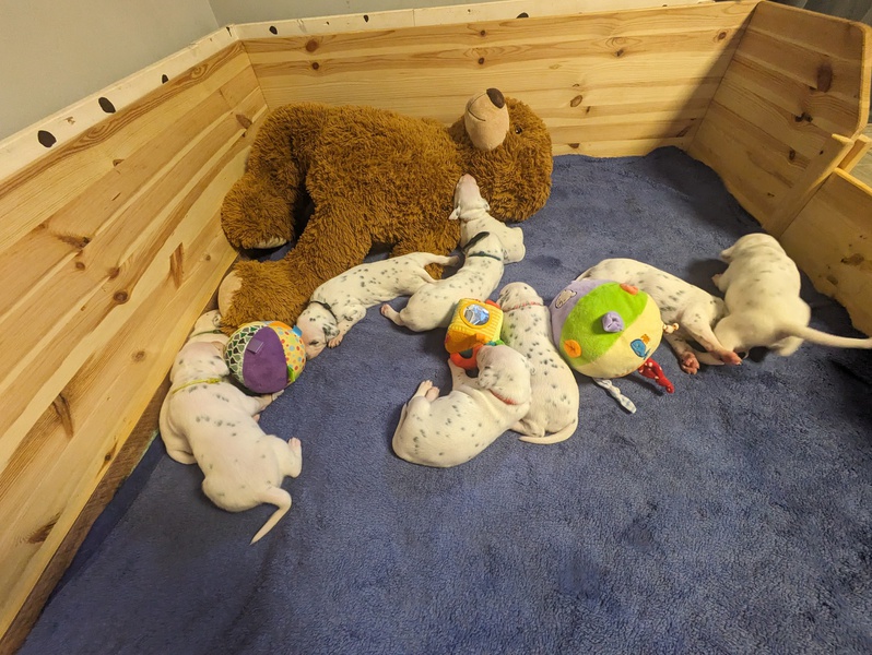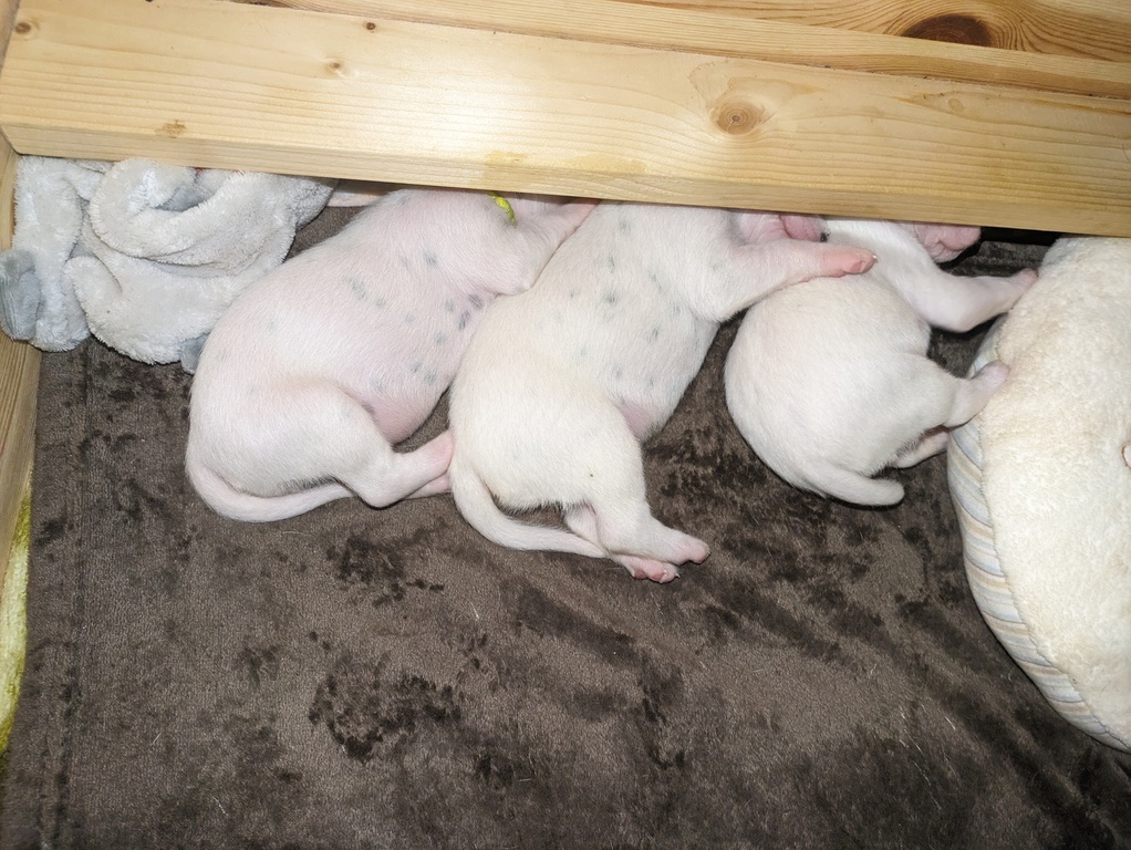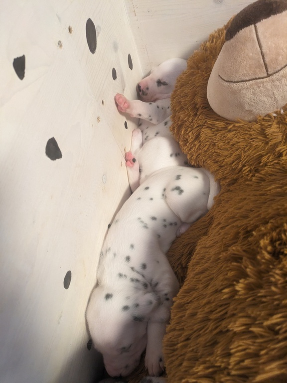 Die Pünktchen Bande nimmt gut zu, damit sind wir völlig zufrieden. Die Schlafensphansen sind auch schon etwas länger, jedoch ist dann richtig Party wenn alle wach sind und an die Milchbar wollen. Die ersten Äuglein sind schon auf. Herr Schwarz war hier der Erste, er ist insgesamt relativ flott, auch beim laufen und erkunden. Frau Gelb, Frau Oliv, Frau Orange und Herr Petrol haben ebenfalls die Augen offen. Die restlichen 5 lassen sich noch etwas Zeit damit, sie wollen wohl noch nicht die Welt sehen. Trotzdem sind sie alle schon recht gut auf ihren Beinchen unterwegs und die ganze Wurfbox wird erkundet. Ist mal kein Spielzeug in der Box, so finden sie das überhaupt nicht gut, schließlich wollen sie auf die Kuscheltiere drauf klettern oder sich darunter verstecken zum schlafen. Zur Not müssen halt die Geschwister her halten und werden als Kopfkissen benutzt. Es wird auch schon fleißig am Geschwisterchen herum gekanabbert und auch an Mama Ami. Es wird sich schon hingesetzt wie ein Großer und auch die Bellversuche werden immer besser. Das Körbchen reicht nun auch nicht mehr aus und so sind wir auf eine Faltbox umgestiegen, dies fanden sie am ersten Tag allerdings nicht so lustig und Herr Petrol hat dies auch laut verkündet und fleißig gebellt. Dies hört sich natürlich aktuell alles noch sehr lustig an. Nach kurzer Zeit, fanden es aber alle in Ordnung und haben sich friedlich ineinander gekuschelt und geschlafen. Auch der Distanzrahmen ist abgekommen, denn da passen sie nicht mehr drunter und so ist gefühlt auch etwas mehr Platz in der Box.