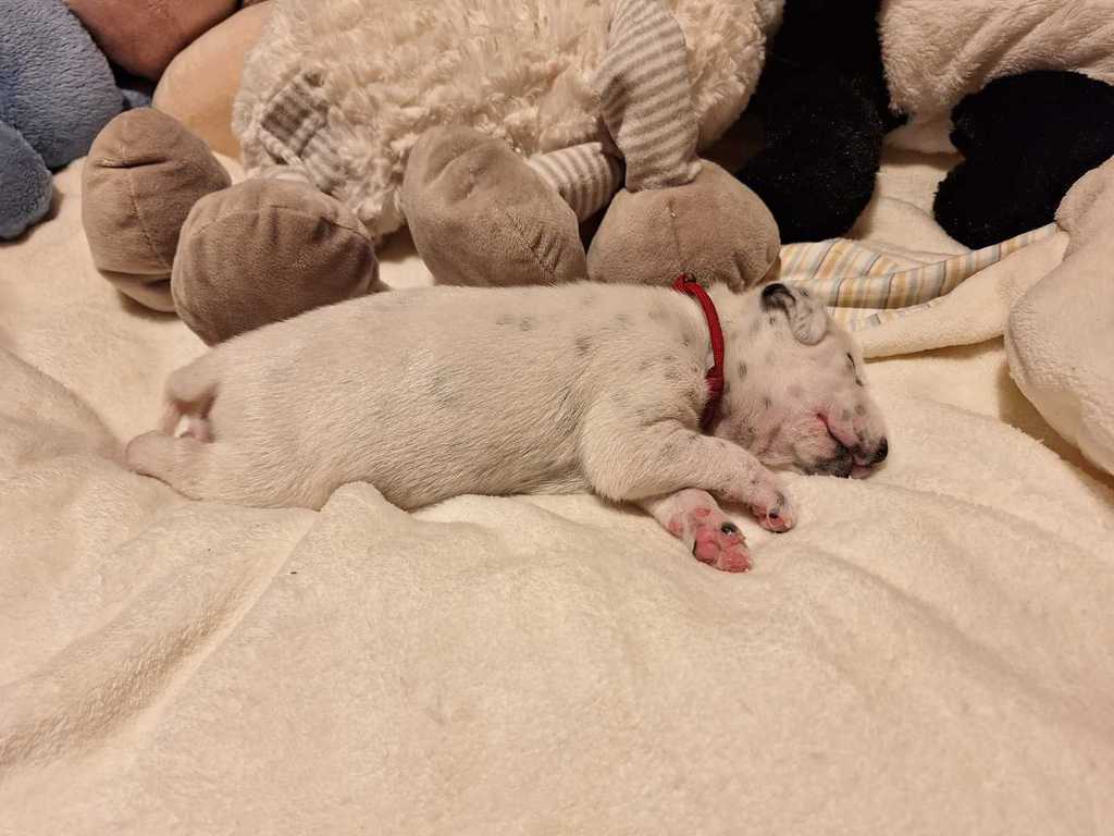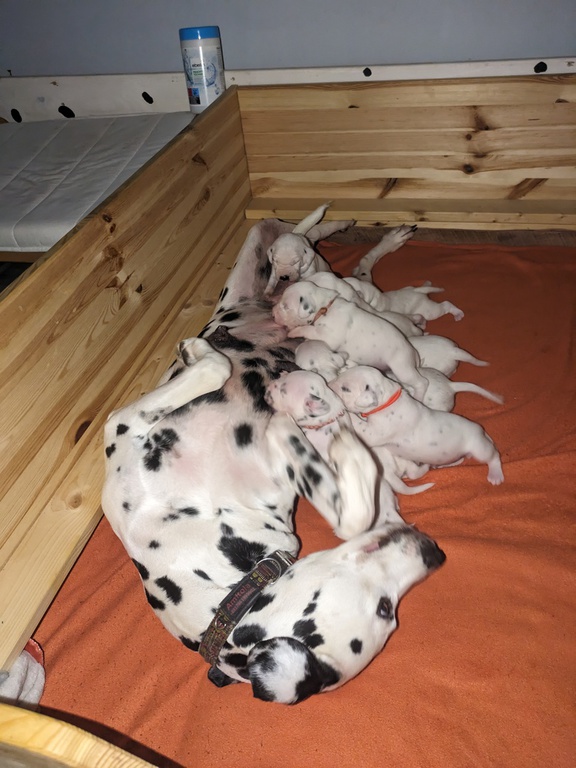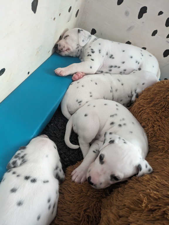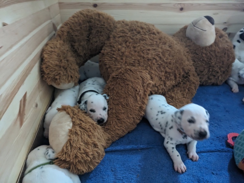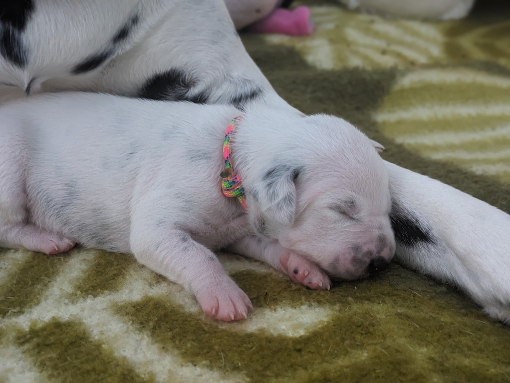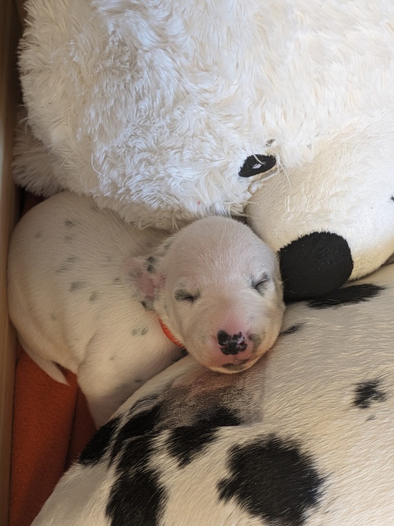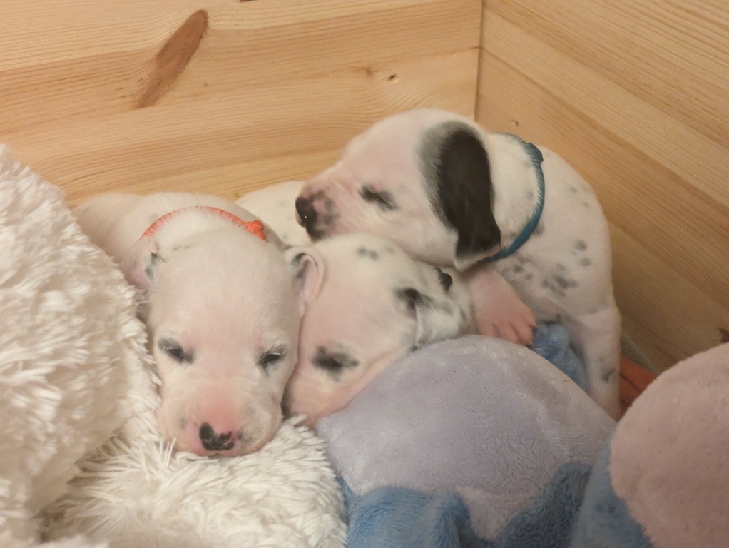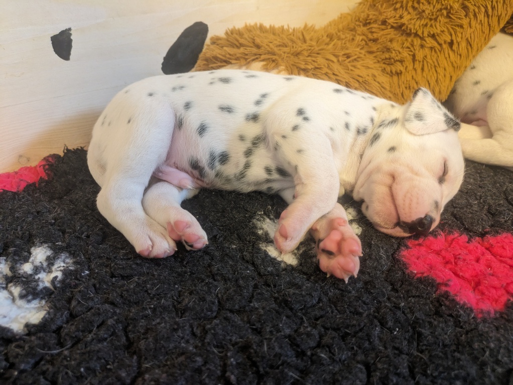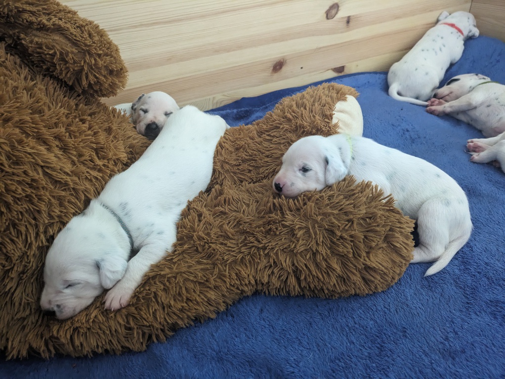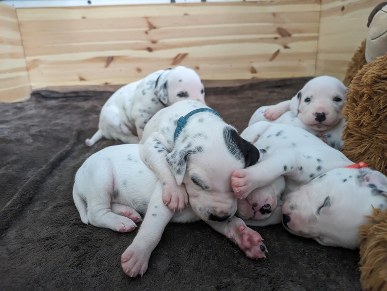 Die Pünktchen Bande nimmt gut zu, damit sind wir völlig zufrieden. Die Schlafensphansen sind auch schon etwas länger, jedoch ist dann richtig Party wenn alle wach sind und an die Milchbar wollen. Die ersten Äuglein sind schon auf. Herr Schwarz war hier der Erste, er ist insgesamt relativ flott, auch beim laufen und erkunden. Frau Gelb, Frau Oliv, Frau Orange und Herr Petrol haben ebenfalls die Augen offen. Die restlichen 5 lassen sich noch etwas Zeit damit, sie wollen wohl noch nicht die Welt sehen. Trotzdem sind sie alle schon recht gut auf ihren Beinchen unterwegs und die ganze Wurfbox wird erkundet. Ist mal kein Spielzeug in der Box, so finden sie das überhaupt nicht gut, schließlich wollen sie auf die Kuscheltiere drauf klettern oder sich darunter verstecken zum schlafen. Zur Not müssen halt die Geschwister her halten und werden als Kopfkissen benutzt. Es wird auch schon fleißig am Geschwisterchen herum gekanabbert und auch an Mama Ami. Es wird sich schon hingesetzt wie ein Großer und auch die Bellversuche werden immer besser. Das Körbchen reicht nun auch nicht mehr aus und so sind wir auf eine Faltbox umgestiegen, dies fanden sie am ersten Tag allerdings nicht so lustig und Herr Petrol hat dies auch laut verkündet und fleißig gebellt. Dies hört sich natürlich aktuell alles noch sehr lustig an. Nach kurzer Zeit, fanden es aber alle in Ordnung und haben sich friedlich ineinander gekuschelt und geschlafen. Auch der Distanzrahmen ist abgekommen, denn da passen sie nicht mehr drunter und so ist gefühlt auch etwas mehr Platz in der Box.