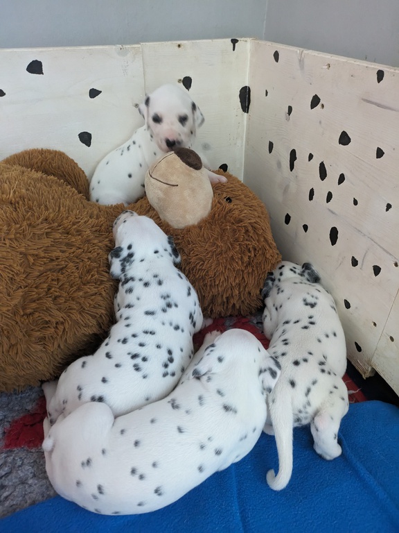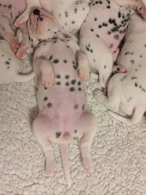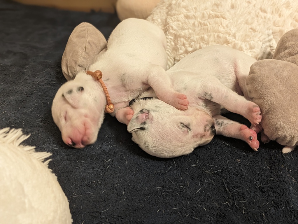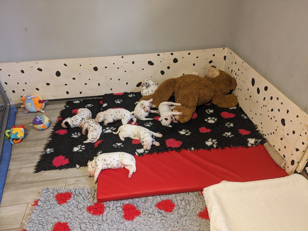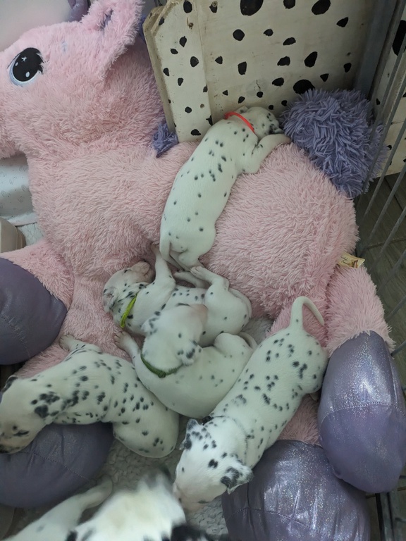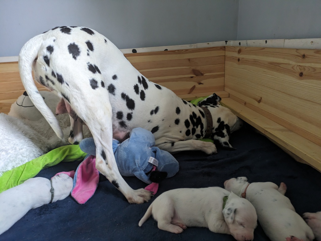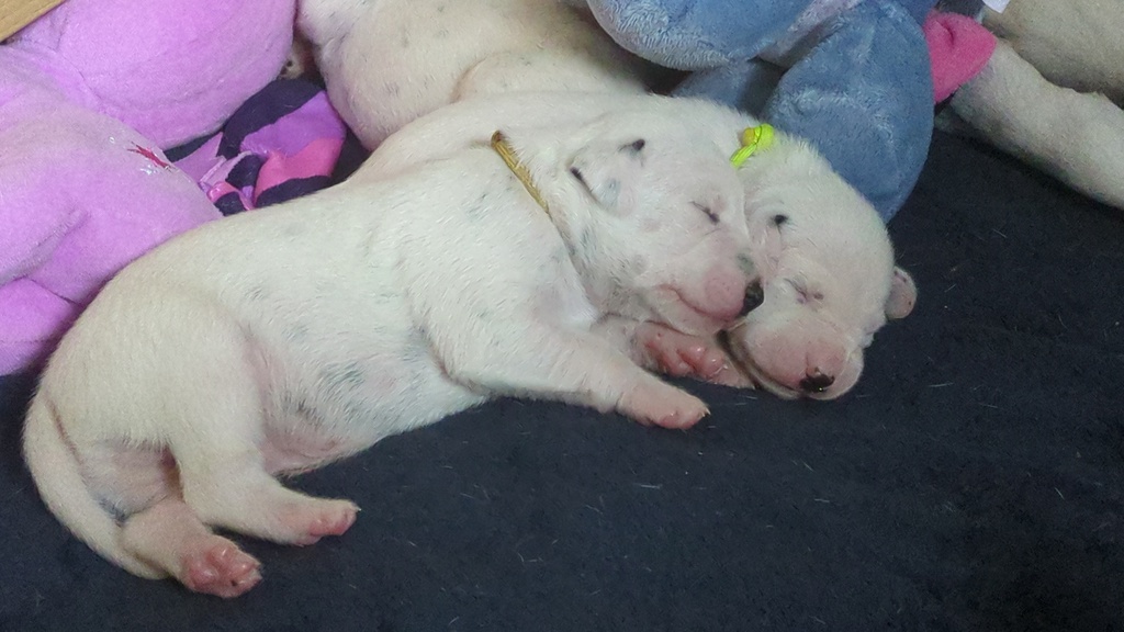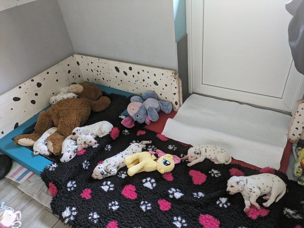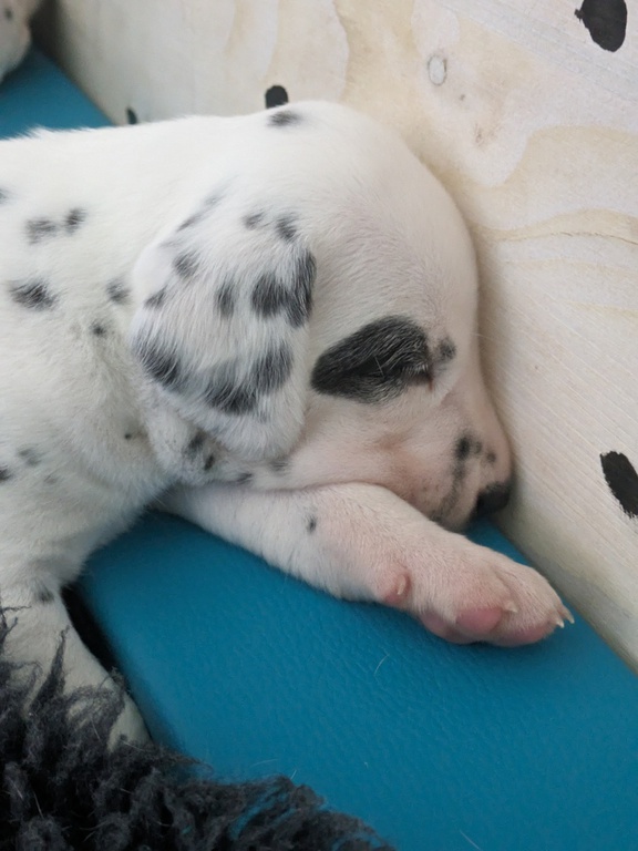 Die Pünktchen Bande nimmt gut zu, damit sind wir völlig zufrieden. Die Schlafensphansen sind auch schon etwas länger, jedoch ist dann richtig Party wenn alle wach sind und an die Milchbar wollen. Die ersten Äuglein sind schon auf. Herr Schwarz war hier der Erste, er ist insgesamt relativ flott, auch beim laufen und erkunden. Frau Gelb, Frau Oliv, Frau Orange und Herr Petrol haben ebenfalls die Augen offen. Die restlichen 5 lassen sich noch etwas Zeit damit, sie wollen wohl noch nicht die Welt sehen. Trotzdem sind sie alle schon recht gut auf ihren Beinchen unterwegs und die ganze Wurfbox wird erkundet. Ist mal kein Spielzeug in der Box, so finden sie das überhaupt nicht gut, schließlich wollen sie auf die Kuscheltiere drauf klettern oder sich darunter verstecken zum schlafen. Zur Not müssen halt die Geschwister her halten und werden als Kopfkissen benutzt. Es wird auch schon fleißig am Geschwisterchen herum gekanabbert und auch an Mama Ami. Es wird sich schon hingesetzt wie ein Großer und auch die Bellversuche werden immer besser. Das Körbchen reicht nun auch nicht mehr aus und so sind wir auf eine Faltbox umgestiegen, dies fanden sie am ersten Tag allerdings nicht so lustig und Herr Petrol hat dies auch laut verkündet und fleißig gebellt. Dies hört sich natürlich aktuell alles noch sehr lustig an. Nach kurzer Zeit, fanden es aber alle in Ordnung und haben sich friedlich ineinander gekuschelt und geschlafen. Auch der Distanzrahmen ist abgekommen, denn da passen sie nicht mehr drunter und so ist gefühlt auch etwas mehr Platz in der Box.
