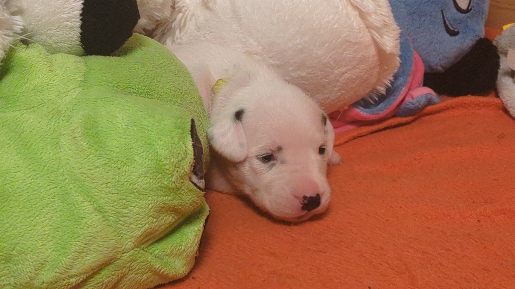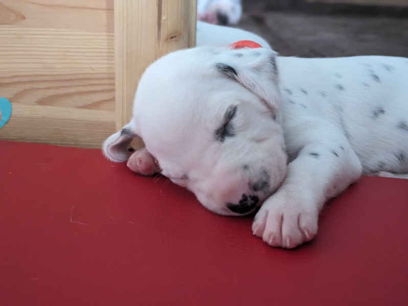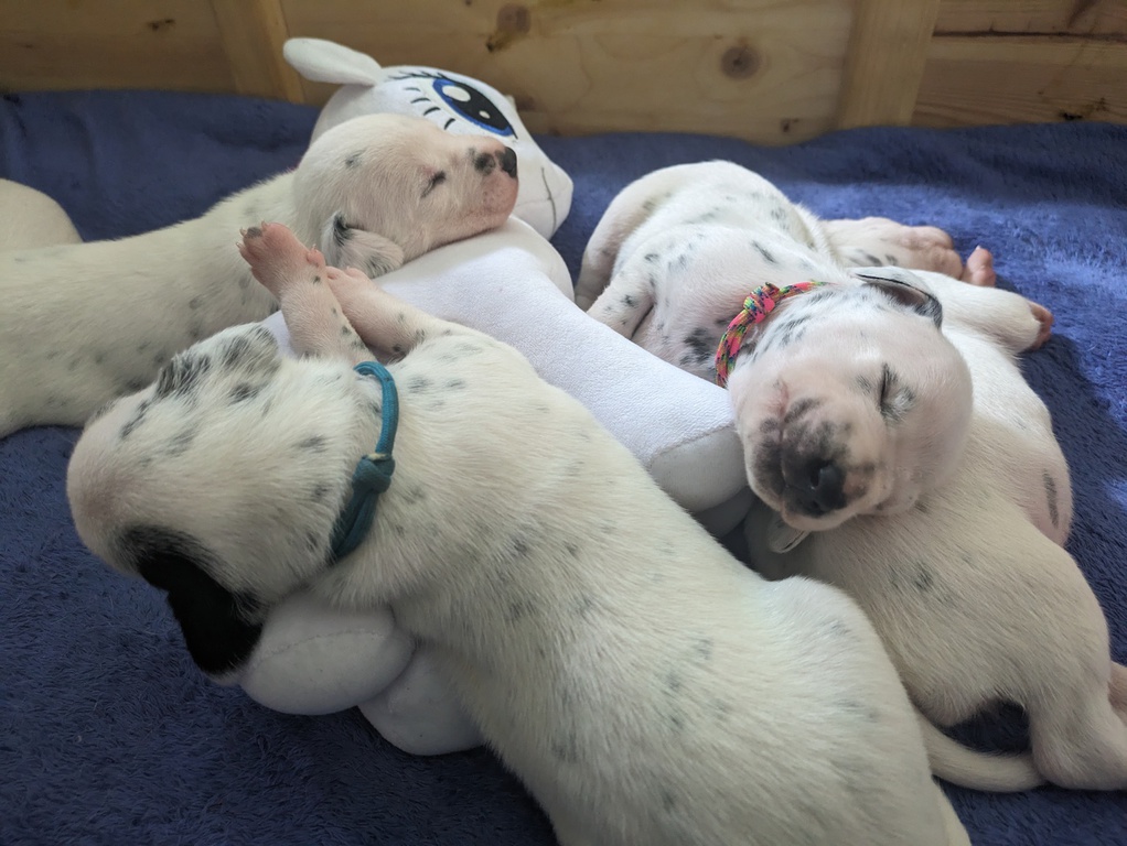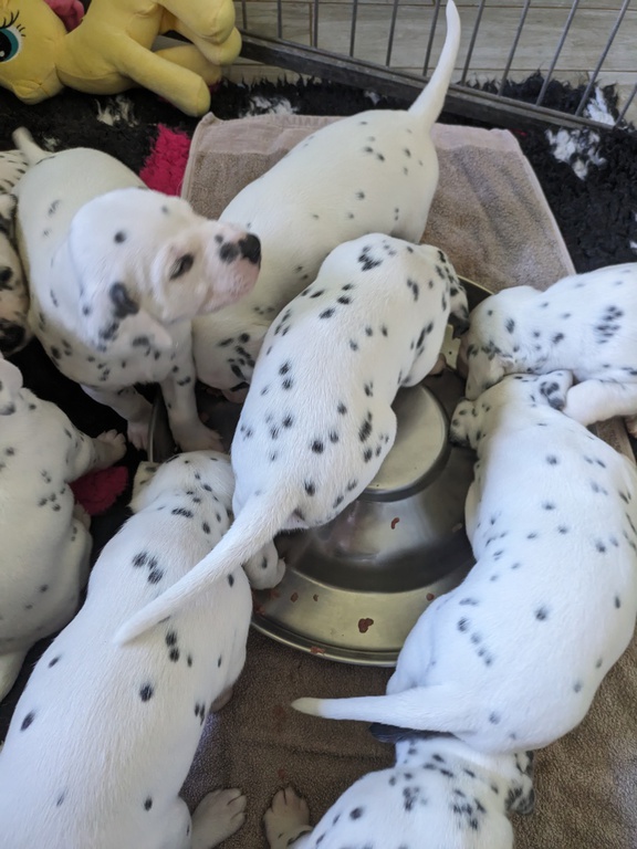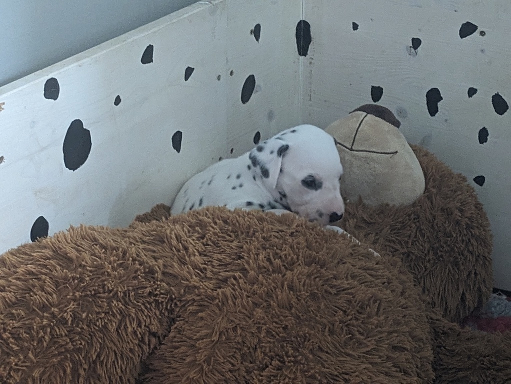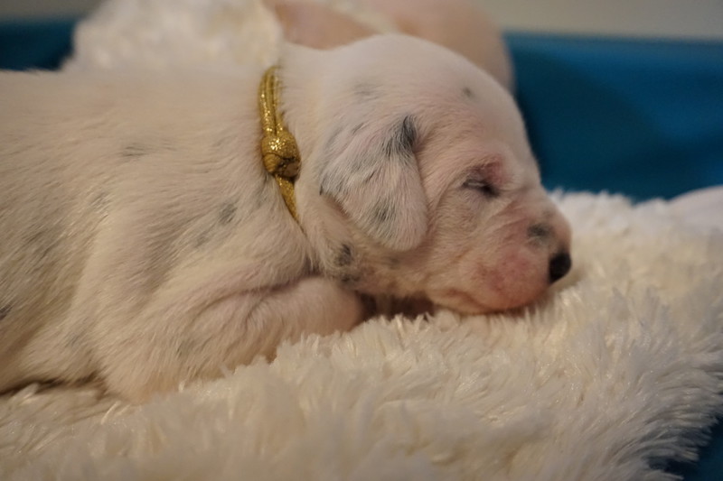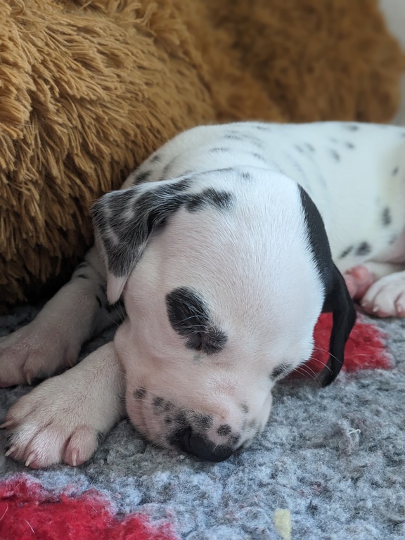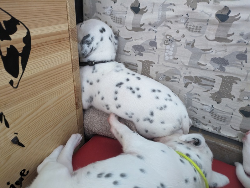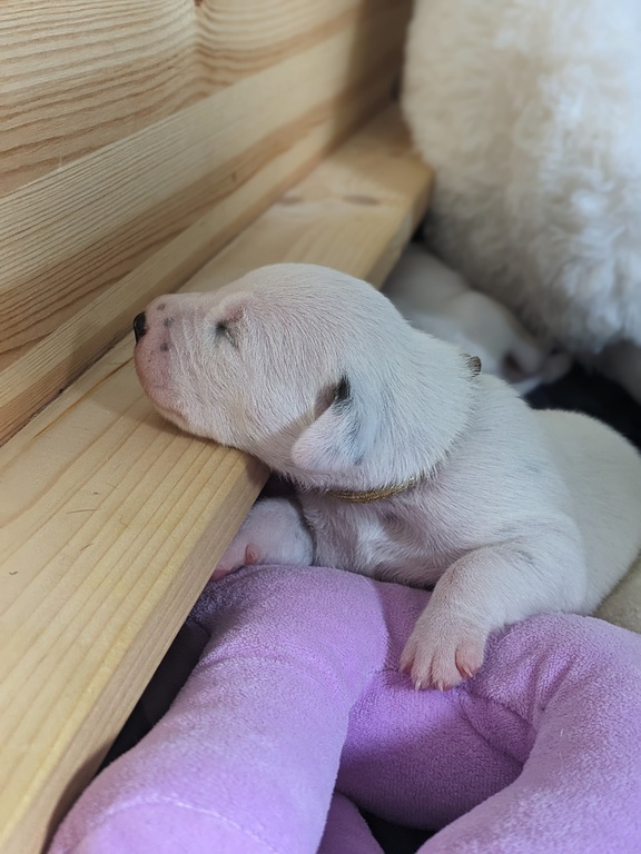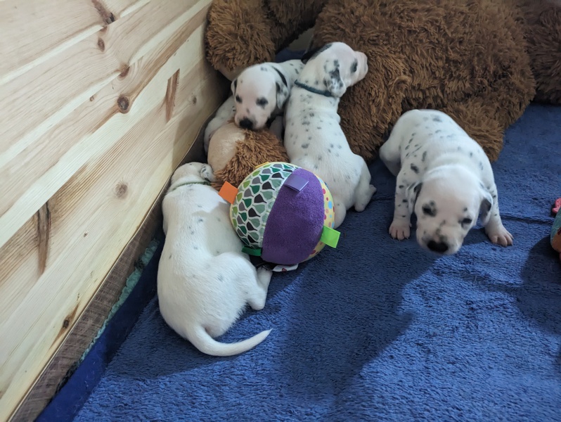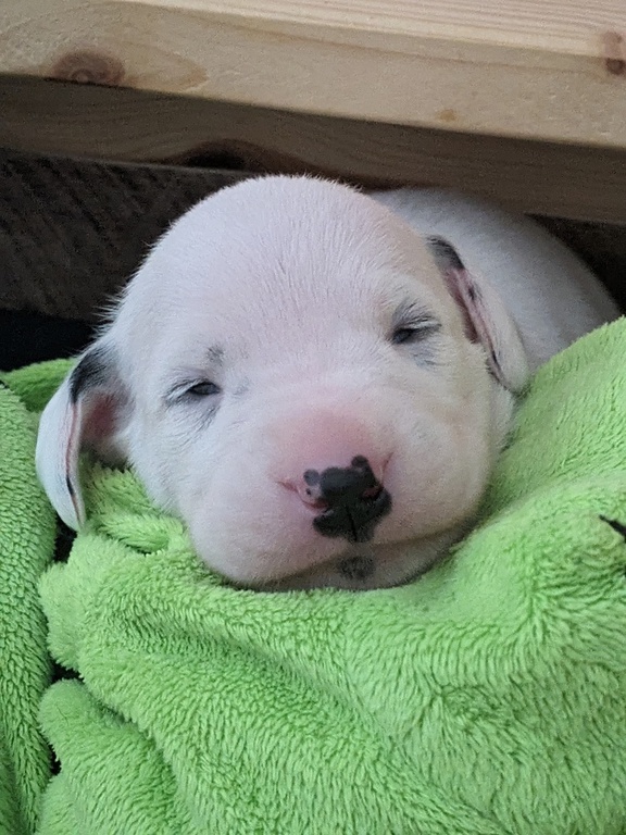 Die Pünktchen Bande nimmt gut zu, damit sind wir völlig zufrieden. Die Schlafensphansen sind auch schon etwas länger, jedoch ist dann richtig Party wenn alle wach sind und an die Milchbar wollen. Die ersten Äuglein sind schon auf. Herr Schwarz war hier der Erste, er ist insgesamt relativ flott, auch beim laufen und erkunden. Frau Gelb, Frau Oliv, Frau Orange und Herr Petrol haben ebenfalls die Augen offen. Die restlichen 5 lassen sich noch etwas Zeit damit, sie wollen wohl noch nicht die Welt sehen. Trotzdem sind sie alle schon recht gut auf ihren Beinchen unterwegs und die ganze Wurfbox wird erkundet. Ist mal kein Spielzeug in der Box, so finden sie das überhaupt nicht gut, schließlich wollen sie auf die Kuscheltiere drauf klettern oder sich darunter verstecken zum schlafen. Zur Not müssen halt die Geschwister her halten und werden als Kopfkissen benutzt. Es wird auch schon fleißig am Geschwisterchen herum gekanabbert und auch an Mama Ami. Es wird sich schon hingesetzt wie ein Großer und auch die Bellversuche werden immer besser. Das Körbchen reicht nun auch nicht mehr aus und so sind wir auf eine Faltbox umgestiegen, dies fanden sie am ersten Tag allerdings nicht so lustig und Herr Petrol hat dies auch laut verkündet und fleißig gebellt. Dies hört sich natürlich aktuell alles noch sehr lustig an. Nach kurzer Zeit, fanden es aber alle in Ordnung und haben sich friedlich ineinander gekuschelt und geschlafen. Auch der Distanzrahmen ist abgekommen, denn da passen sie nicht mehr drunter und so ist gefühlt auch etwas mehr Platz in der Box.