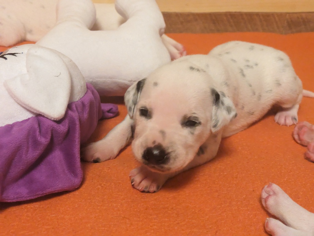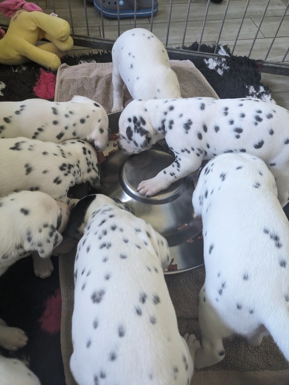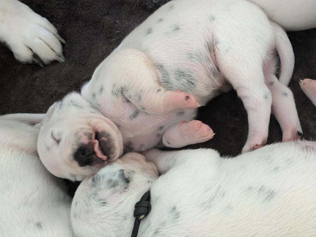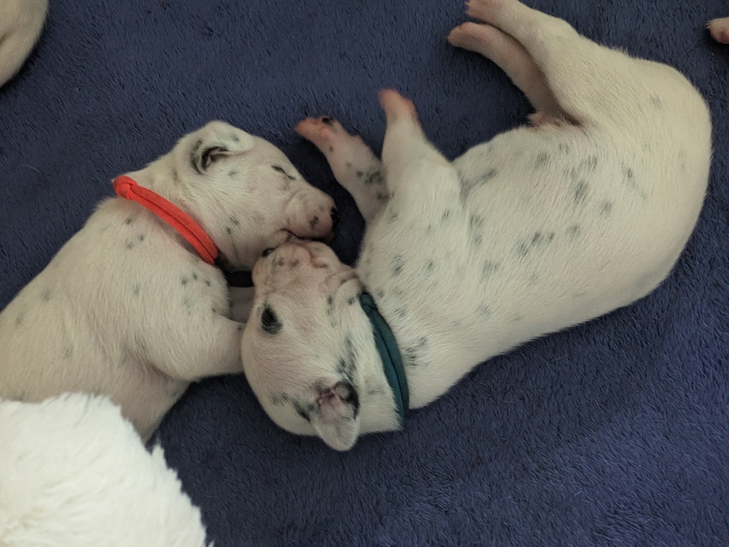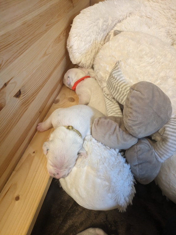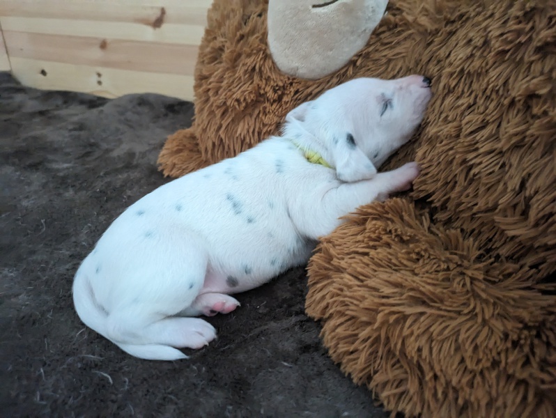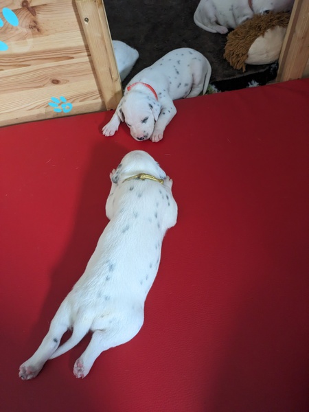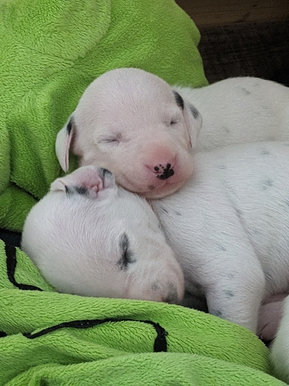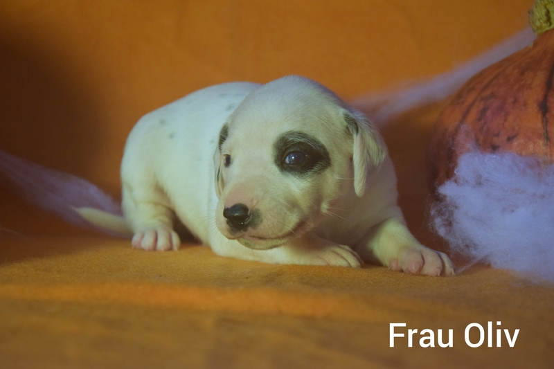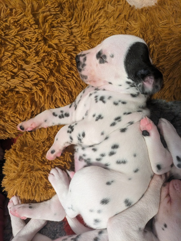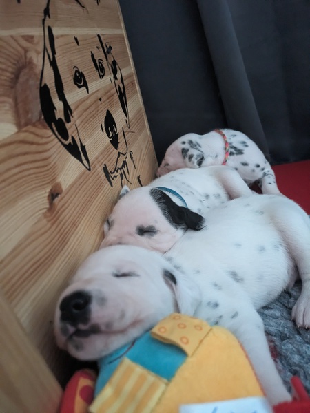 Die Pünktchen Bande nimmt gut zu, damit sind wir völlig zufrieden. Die Schlafensphansen sind auch schon etwas länger, jedoch ist dann richtig Party wenn alle wach sind und an die Milchbar wollen. Die ersten Äuglein sind schon auf. Herr Schwarz war hier der Erste, er ist insgesamt relativ flott, auch beim laufen und erkunden. Frau Gelb, Frau Oliv, Frau Orange und Herr Petrol haben ebenfalls die Augen offen. Die restlichen 5 lassen sich noch etwas Zeit damit, sie wollen wohl noch nicht die Welt sehen. Trotzdem sind sie alle schon recht gut auf ihren Beinchen unterwegs und die ganze Wurfbox wird erkundet. Ist mal kein Spielzeug in der Box, so finden sie das überhaupt nicht gut, schließlich wollen sie auf die Kuscheltiere drauf klettern oder sich darunter verstecken zum schlafen. Zur Not müssen halt die Geschwister her halten und werden als Kopfkissen benutzt. Es wird auch schon fleißig am Geschwisterchen herum gekanabbert und auch an Mama Ami. Es wird sich schon hingesetzt wie ein Großer und auch die Bellversuche werden immer besser. Das Körbchen reicht nun auch nicht mehr aus und so sind wir auf eine Faltbox umgestiegen, dies fanden sie am ersten Tag allerdings nicht so lustig und Herr Petrol hat dies auch laut verkündet und fleißig gebellt. Dies hört sich natürlich aktuell alles noch sehr lustig an. Nach kurzer Zeit, fanden es aber alle in Ordnung und haben sich friedlich ineinander gekuschelt und geschlafen. Auch der Distanzrahmen ist abgekommen, denn da passen sie nicht mehr drunter und so ist gefühlt auch etwas mehr Platz in der Box.