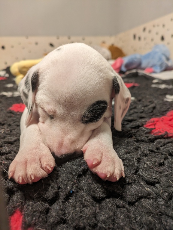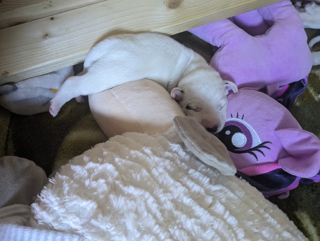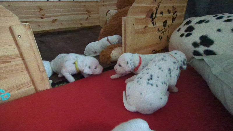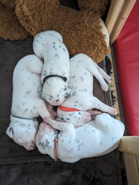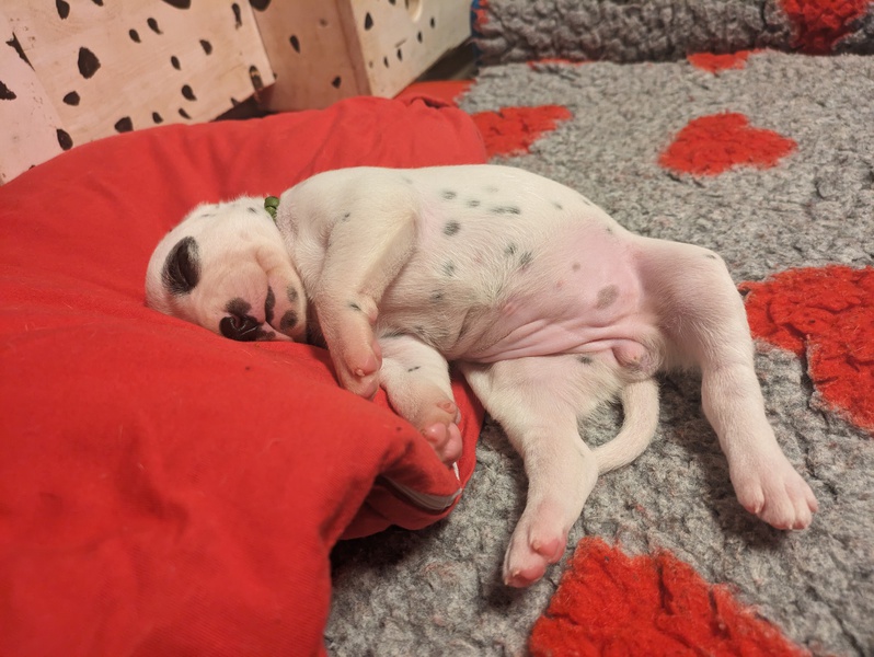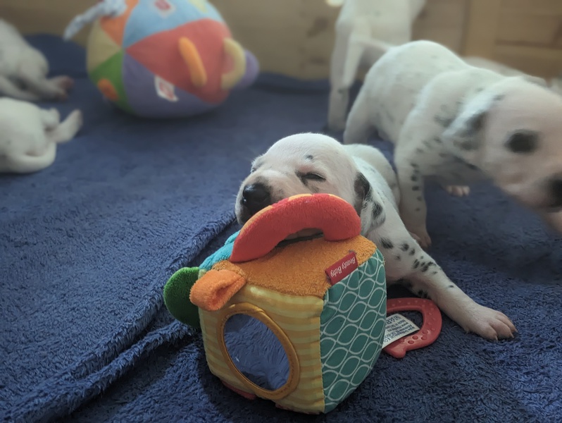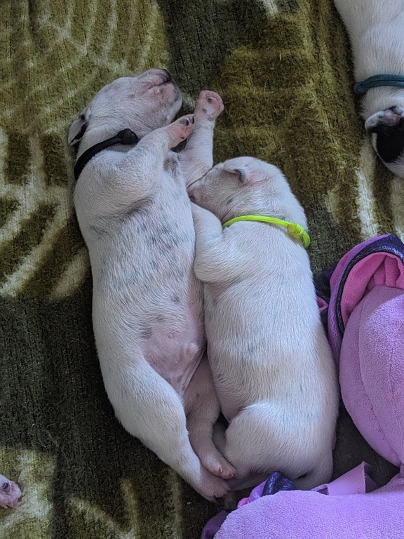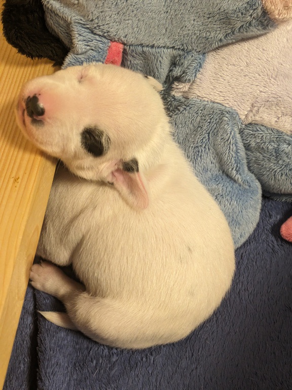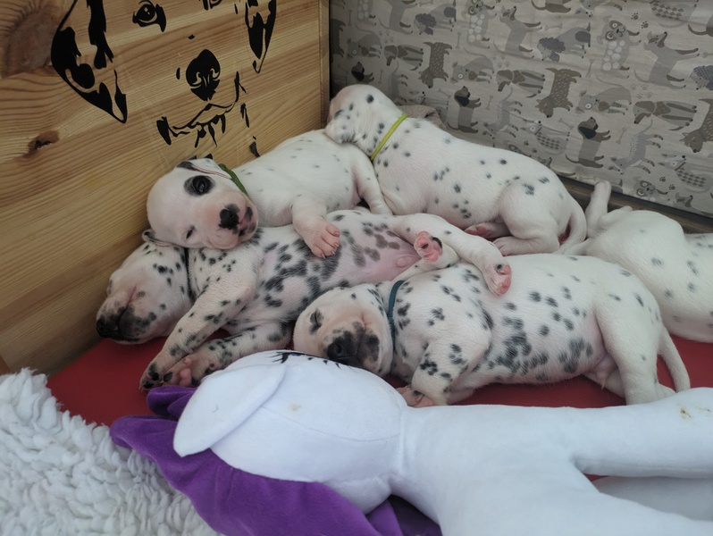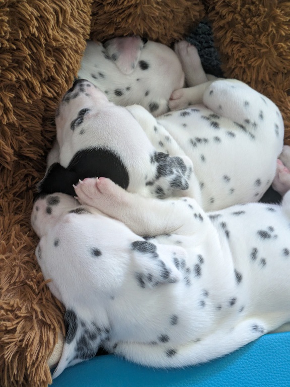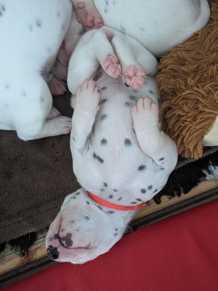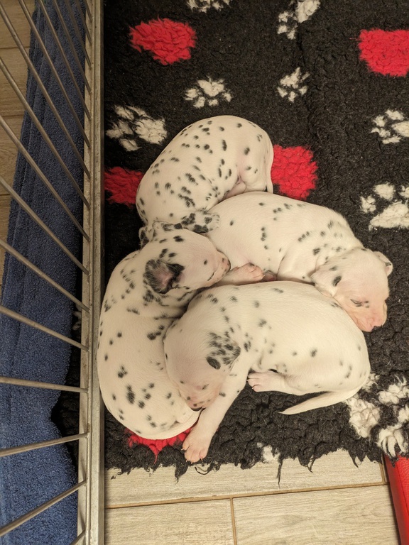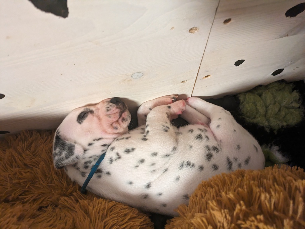 Die Pünktchen Bande nimmt gut zu, damit sind wir völlig zufrieden. Die Schlafensphansen sind auch schon etwas länger, jedoch ist dann richtig Party wenn alle wach sind und an die Milchbar wollen. Die ersten Äuglein sind schon auf. Herr Schwarz war hier der Erste, er ist insgesamt relativ flott, auch beim laufen und erkunden. Frau Gelb, Frau Oliv, Frau Orange und Herr Petrol haben ebenfalls die Augen offen. Die restlichen 5 lassen sich noch etwas Zeit damit, sie wollen wohl noch nicht die Welt sehen. Trotzdem sind sie alle schon recht gut auf ihren Beinchen unterwegs und die ganze Wurfbox wird erkundet. Ist mal kein Spielzeug in der Box, so finden sie das überhaupt nicht gut, schließlich wollen sie auf die Kuscheltiere drauf klettern oder sich darunter verstecken zum schlafen. Zur Not müssen halt die Geschwister her halten und werden als Kopfkissen benutzt. Es wird auch schon fleißig am Geschwisterchen herum gekanabbert und auch an Mama Ami. Es wird sich schon hingesetzt wie ein Großer und auch die Bellversuche werden immer besser. Das Körbchen reicht nun auch nicht mehr aus und so sind wir auf eine Faltbox umgestiegen, dies fanden sie am ersten Tag allerdings nicht so lustig und Herr Petrol hat dies auch laut verkündet und fleißig gebellt. Dies hört sich natürlich aktuell alles noch sehr lustig an. Nach kurzer Zeit, fanden es aber alle in Ordnung und haben sich friedlich ineinander gekuschelt und geschlafen. Auch der Distanzrahmen ist abgekommen, denn da passen sie nicht mehr drunter und so ist gefühlt auch etwas mehr Platz in der Box.