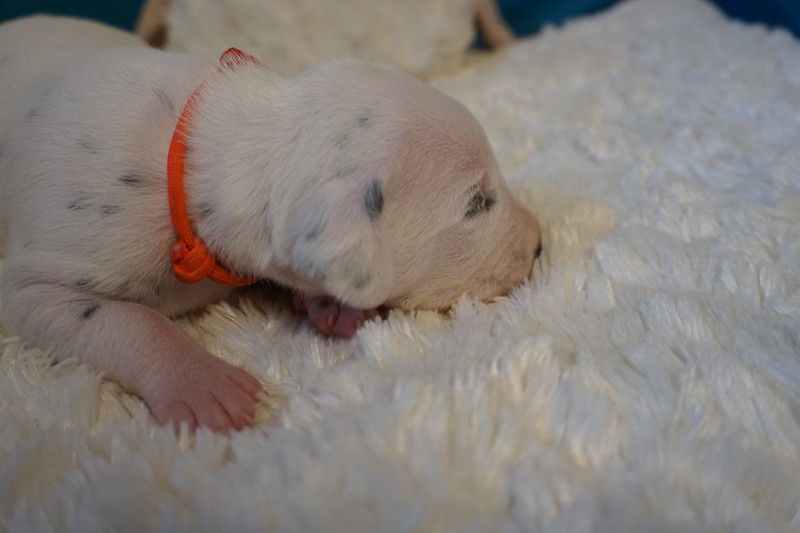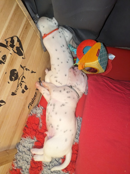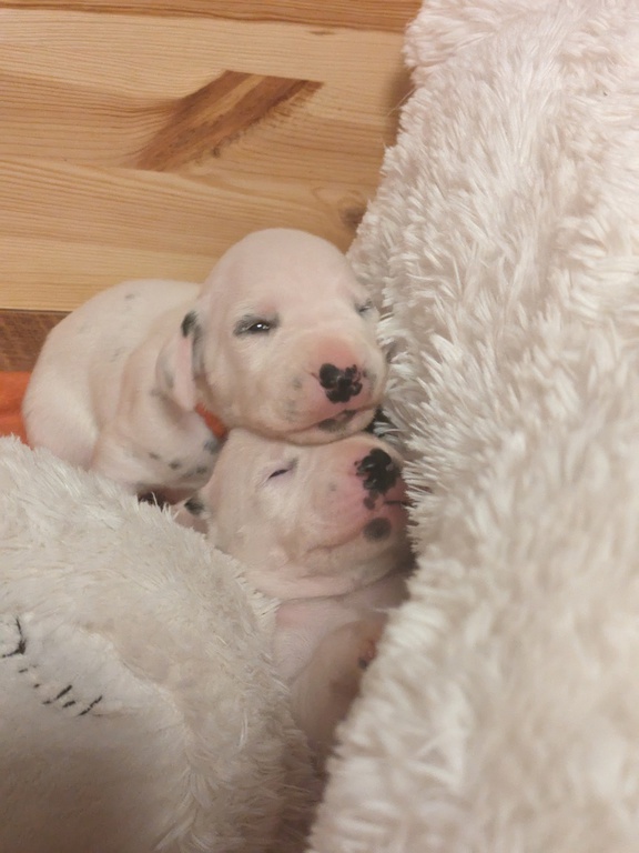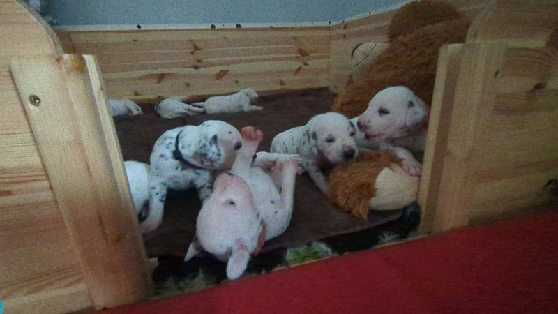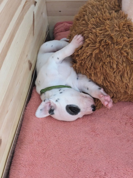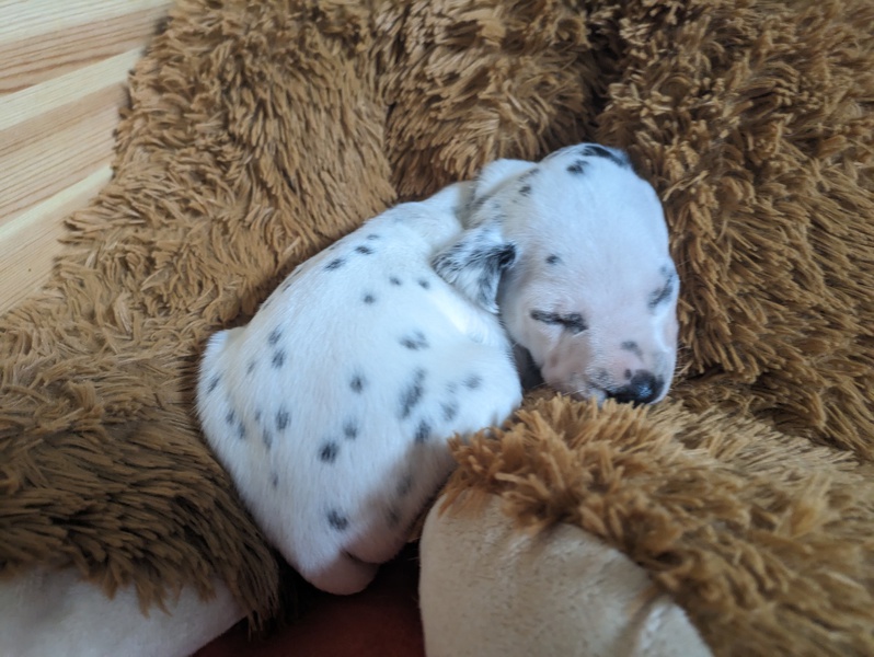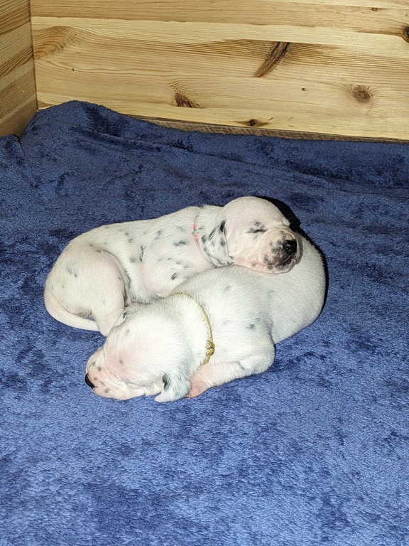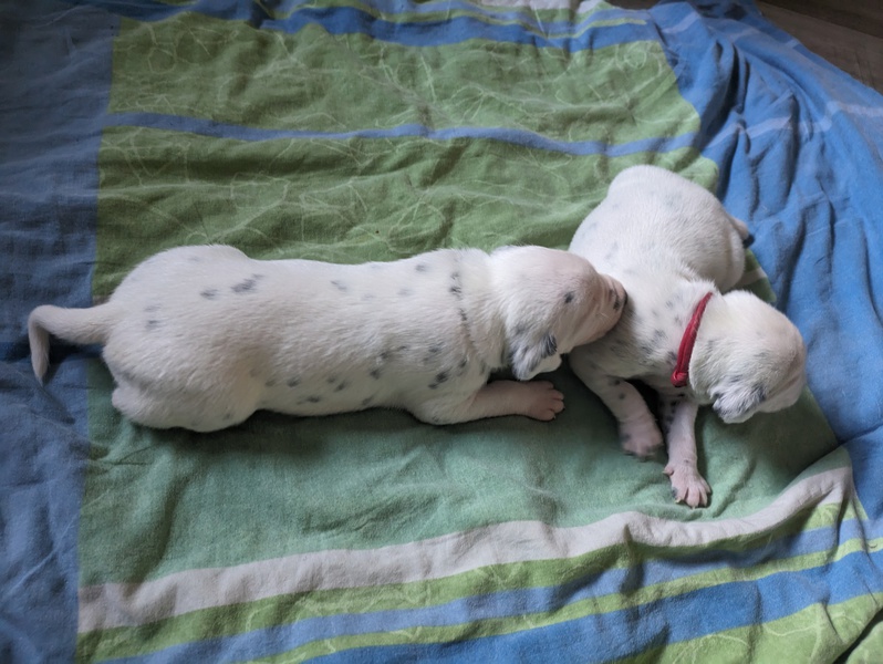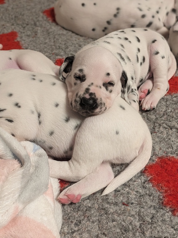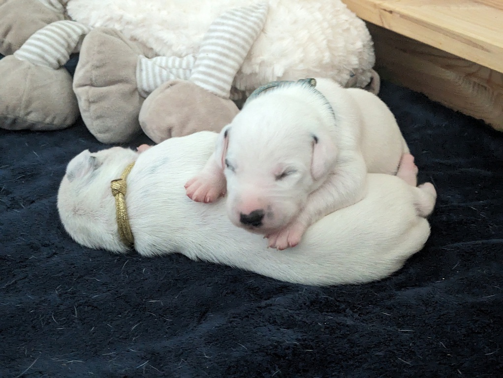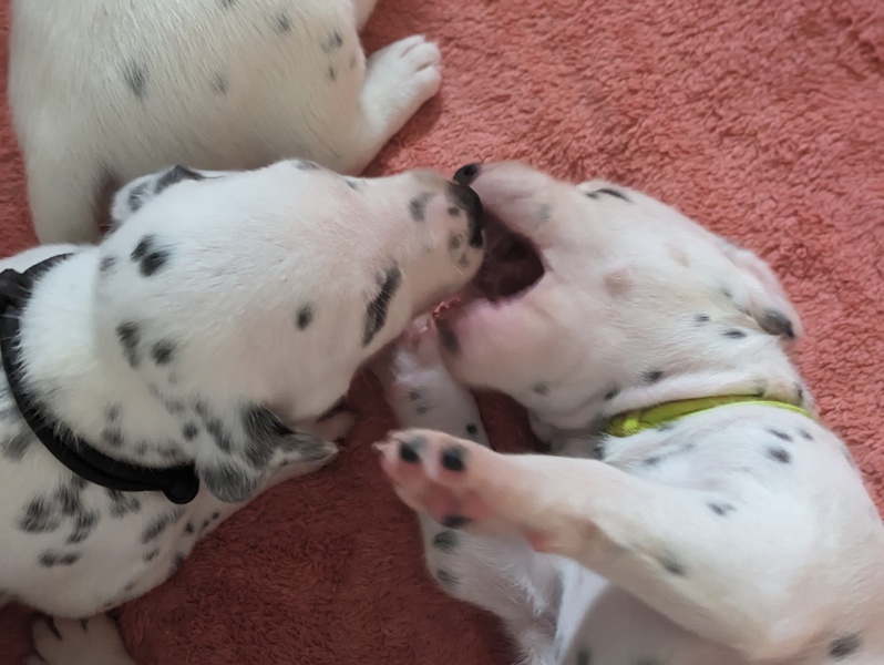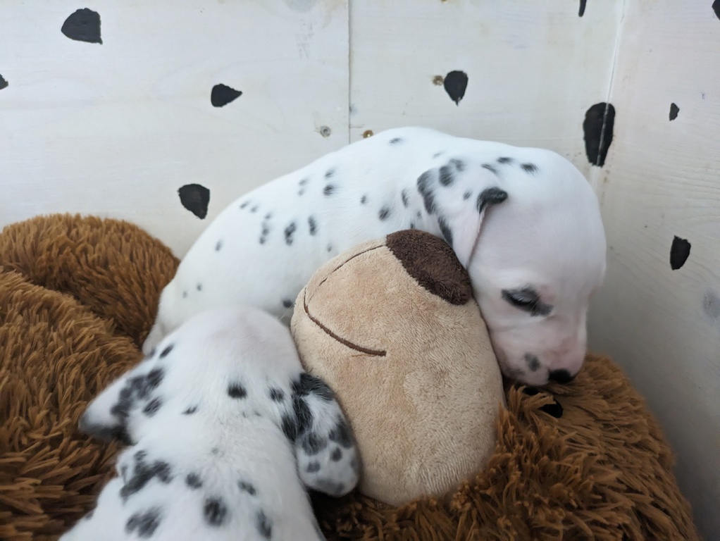 Die Pünktchen Bande nimmt gut zu, damit sind wir völlig zufrieden. Die Schlafensphansen sind auch schon etwas länger, jedoch ist dann richtig Party wenn alle wach sind und an die Milchbar wollen. Die ersten Äuglein sind schon auf. Herr Schwarz war hier der Erste, er ist insgesamt relativ flott, auch beim laufen und erkunden. Frau Gelb, Frau Oliv, Frau Orange und Herr Petrol haben ebenfalls die Augen offen. Die restlichen 5 lassen sich noch etwas Zeit damit, sie wollen wohl noch nicht die Welt sehen. Trotzdem sind sie alle schon recht gut auf ihren Beinchen unterwegs und die ganze Wurfbox wird erkundet. Ist mal kein Spielzeug in der Box, so finden sie das überhaupt nicht gut, schließlich wollen sie auf die Kuscheltiere drauf klettern oder sich darunter verstecken zum schlafen. Zur Not müssen halt die Geschwister her halten und werden als Kopfkissen benutzt. Es wird auch schon fleißig am Geschwisterchen herum gekanabbert und auch an Mama Ami. Es wird sich schon hingesetzt wie ein Großer und auch die Bellversuche werden immer besser. Das Körbchen reicht nun auch nicht mehr aus und so sind wir auf eine Faltbox umgestiegen, dies fanden sie am ersten Tag allerdings nicht so lustig und Herr Petrol hat dies auch laut verkündet und fleißig gebellt. Dies hört sich natürlich aktuell alles noch sehr lustig an. Nach kurzer Zeit, fanden es aber alle in Ordnung und haben sich friedlich ineinander gekuschelt und geschlafen. Auch der Distanzrahmen ist abgekommen, denn da passen sie nicht mehr drunter und so ist gefühlt auch etwas mehr Platz in der Box.