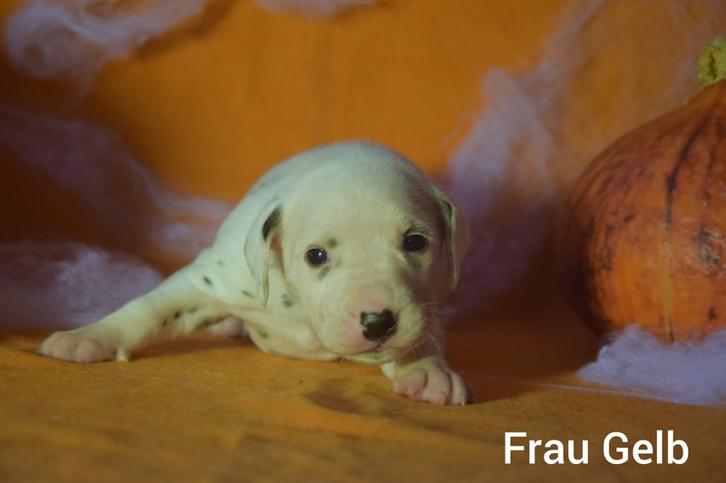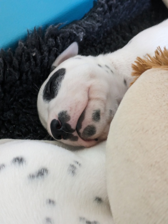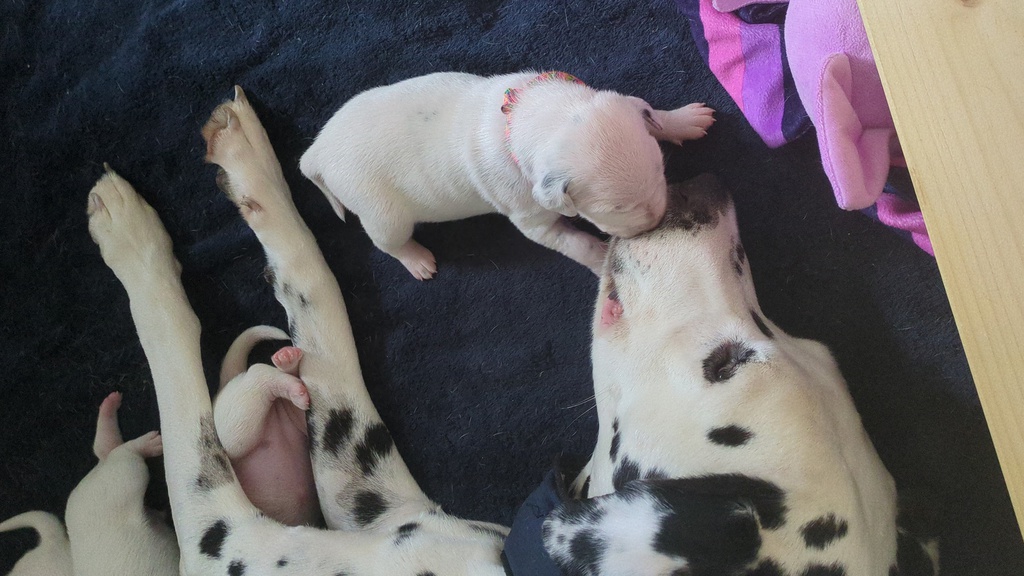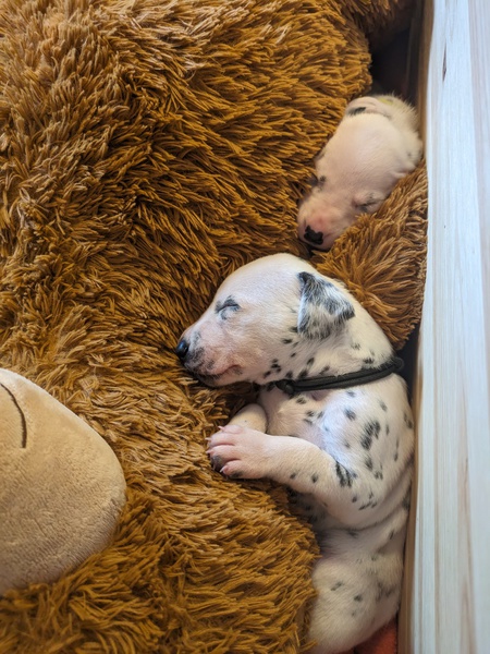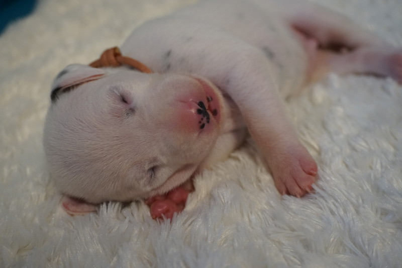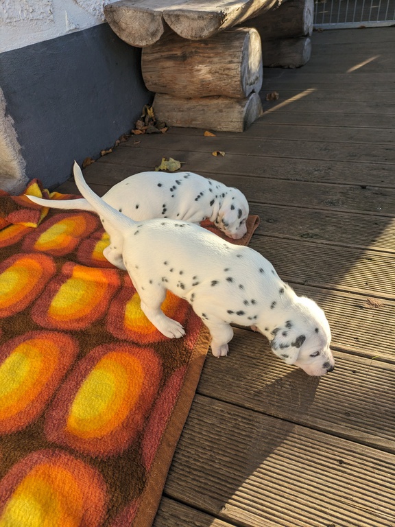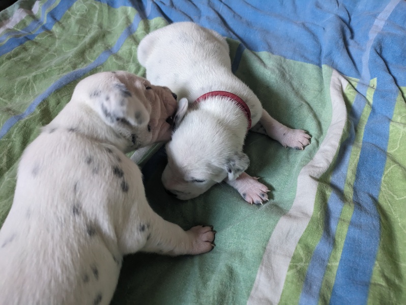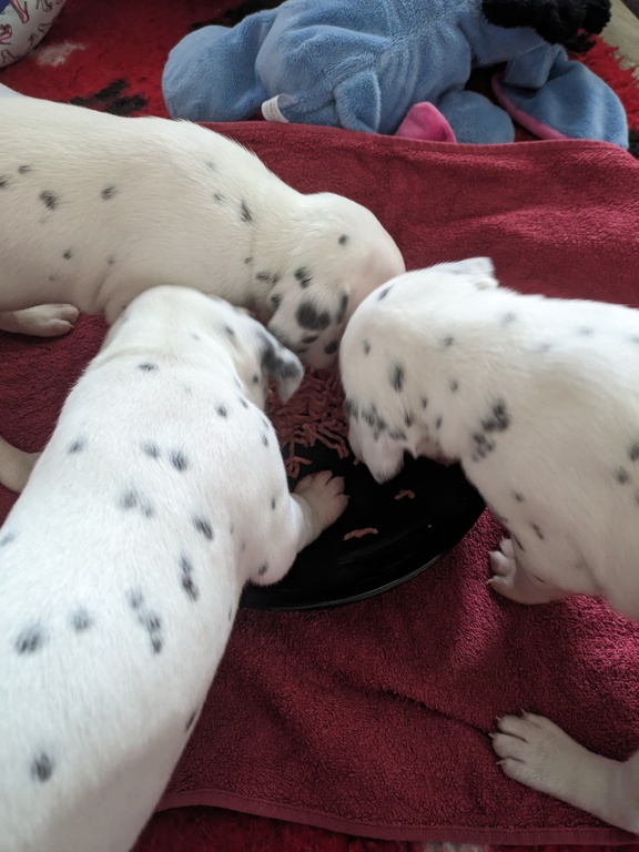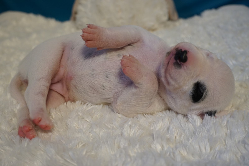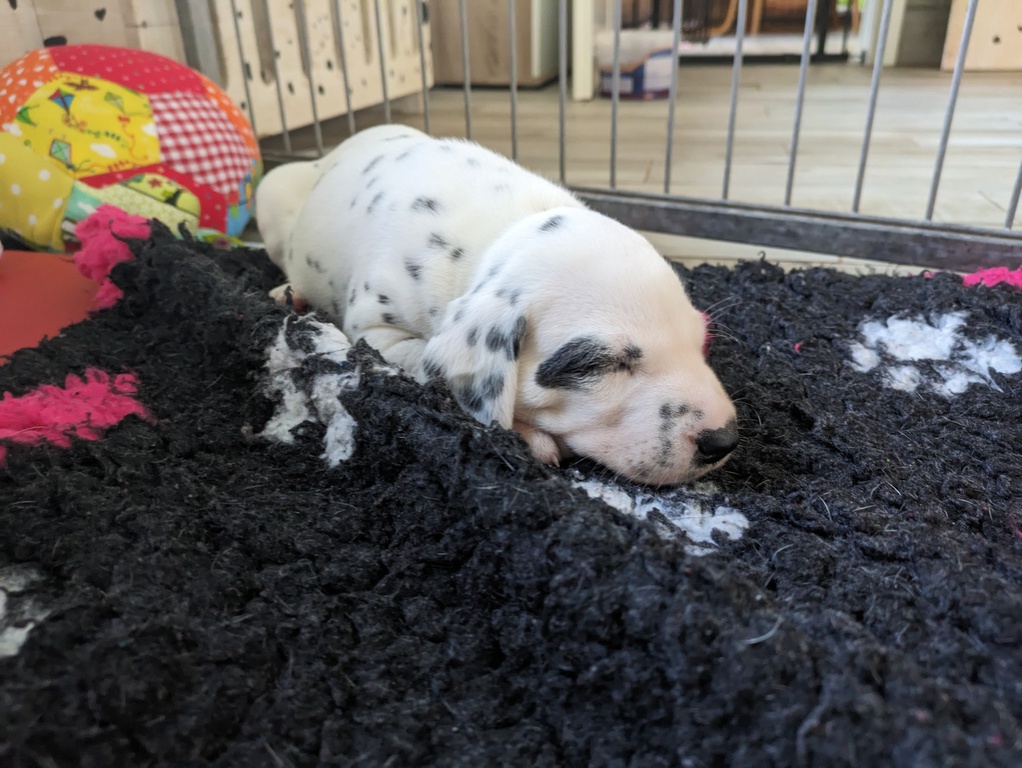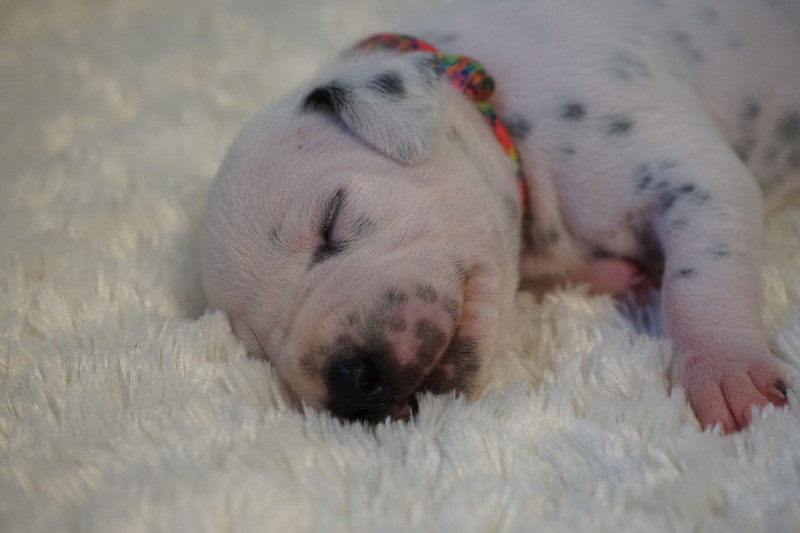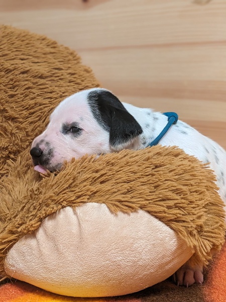 Die Pünktchen Bande nimmt gut zu, damit sind wir völlig zufrieden. Die Schlafensphansen sind auch schon etwas länger, jedoch ist dann richtig Party wenn alle wach sind und an die Milchbar wollen. Die ersten Äuglein sind schon auf. Herr Schwarz war hier der Erste, er ist insgesamt relativ flott, auch beim laufen und erkunden. Frau Gelb, Frau Oliv, Frau Orange und Herr Petrol haben ebenfalls die Augen offen. Die restlichen 5 lassen sich noch etwas Zeit damit, sie wollen wohl noch nicht die Welt sehen. Trotzdem sind sie alle schon recht gut auf ihren Beinchen unterwegs und die ganze Wurfbox wird erkundet. Ist mal kein Spielzeug in der Box, so finden sie das überhaupt nicht gut, schließlich wollen sie auf die Kuscheltiere drauf klettern oder sich darunter verstecken zum schlafen. Zur Not müssen halt die Geschwister her halten und werden als Kopfkissen benutzt. Es wird auch schon fleißig am Geschwisterchen herum gekanabbert und auch an Mama Ami. Es wird sich schon hingesetzt wie ein Großer und auch die Bellversuche werden immer besser. Das Körbchen reicht nun auch nicht mehr aus und so sind wir auf eine Faltbox umgestiegen, dies fanden sie am ersten Tag allerdings nicht so lustig und Herr Petrol hat dies auch laut verkündet und fleißig gebellt. Dies hört sich natürlich aktuell alles noch sehr lustig an. Nach kurzer Zeit, fanden es aber alle in Ordnung und haben sich friedlich ineinander gekuschelt und geschlafen. Auch der Distanzrahmen ist abgekommen, denn da passen sie nicht mehr drunter und so ist gefühlt auch etwas mehr Platz in der Box.