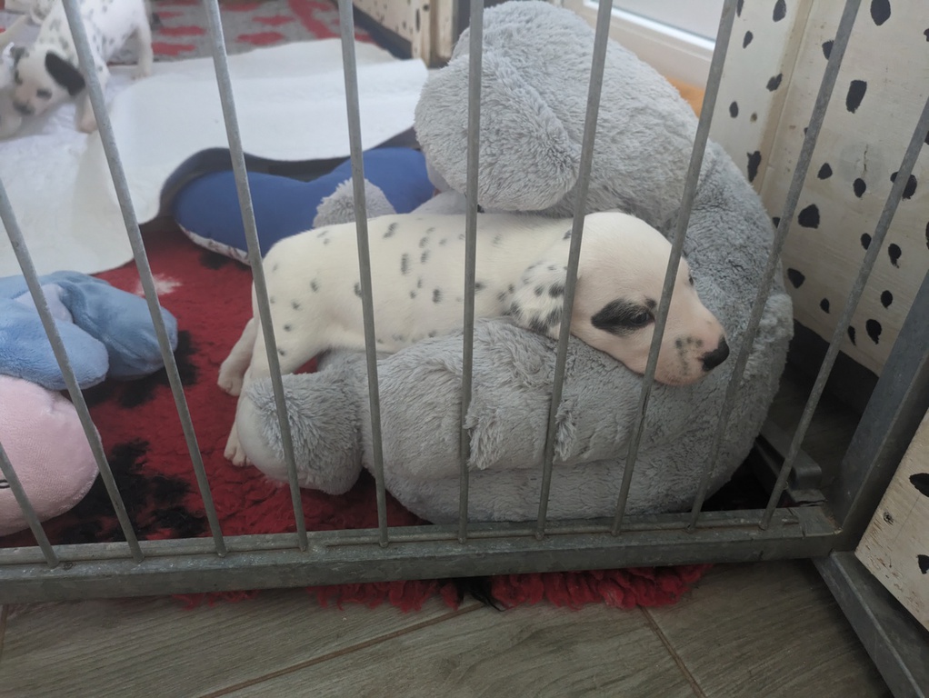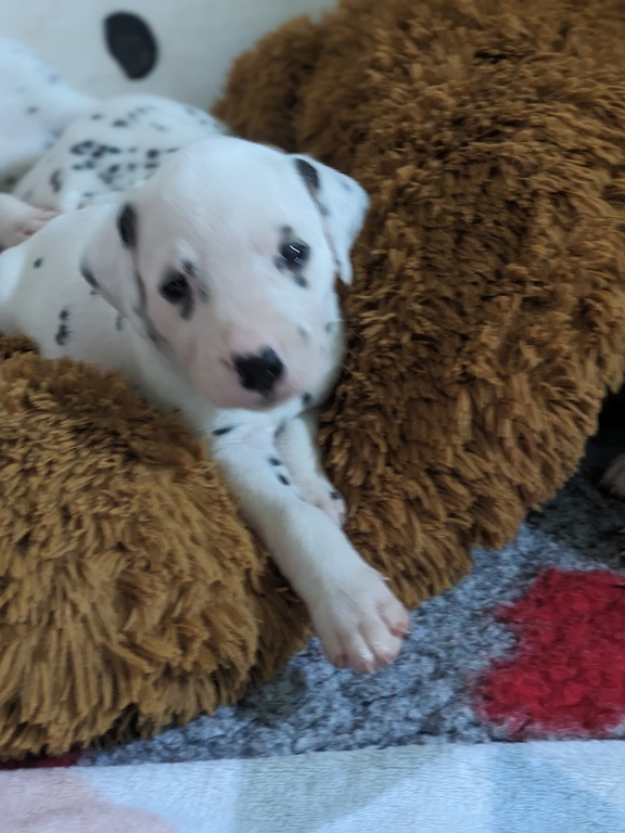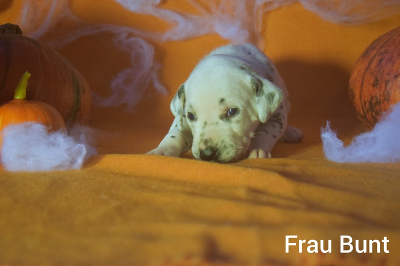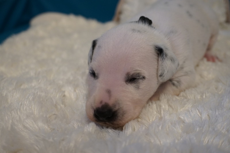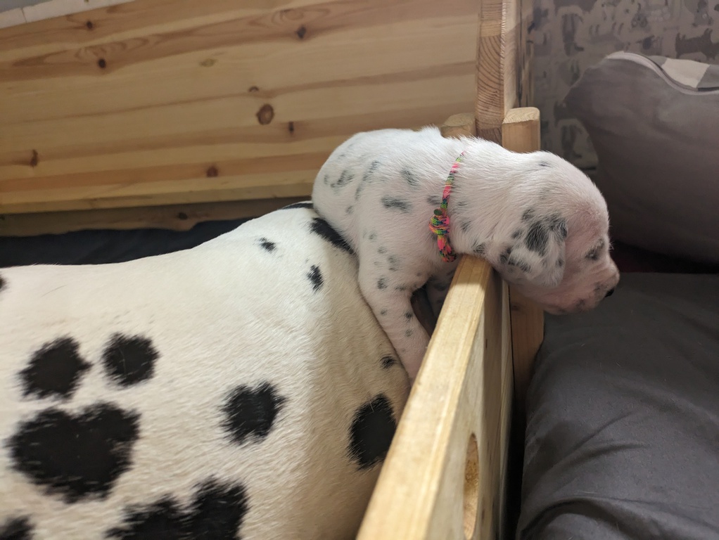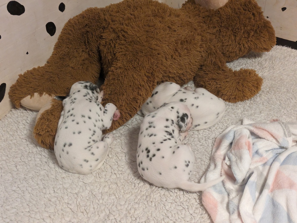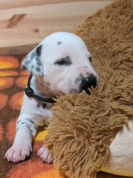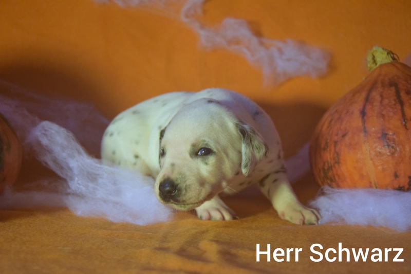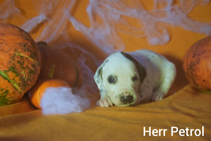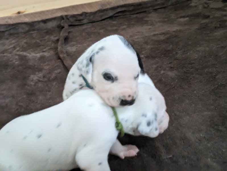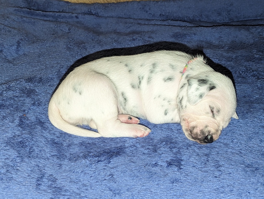 Die Pünktchen Bande nimmt gut zu, damit sind wir völlig zufrieden. Die Schlafensphansen sind auch schon etwas länger, jedoch ist dann richtig Party wenn alle wach sind und an die Milchbar wollen. Die ersten Äuglein sind schon auf. Herr Schwarz war hier der Erste, er ist insgesamt relativ flott, auch beim laufen und erkunden. Frau Gelb, Frau Oliv, Frau Orange und Herr Petrol haben ebenfalls die Augen offen. Die restlichen 5 lassen sich noch etwas Zeit damit, sie wollen wohl noch nicht die Welt sehen. Trotzdem sind sie alle schon recht gut auf ihren Beinchen unterwegs und die ganze Wurfbox wird erkundet. Ist mal kein Spielzeug in der Box, so finden sie das überhaupt nicht gut, schließlich wollen sie auf die Kuscheltiere drauf klettern oder sich darunter verstecken zum schlafen. Zur Not müssen halt die Geschwister her halten und werden als Kopfkissen benutzt. Es wird auch schon fleißig am Geschwisterchen herum gekanabbert und auch an Mama Ami. Es wird sich schon hingesetzt wie ein Großer und auch die Bellversuche werden immer besser. Das Körbchen reicht nun auch nicht mehr aus und so sind wir auf eine Faltbox umgestiegen, dies fanden sie am ersten Tag allerdings nicht so lustig und Herr Petrol hat dies auch laut verkündet und fleißig gebellt. Dies hört sich natürlich aktuell alles noch sehr lustig an. Nach kurzer Zeit, fanden es aber alle in Ordnung und haben sich friedlich ineinander gekuschelt und geschlafen. Auch der Distanzrahmen ist abgekommen, denn da passen sie nicht mehr drunter und so ist gefühlt auch etwas mehr Platz in der Box.