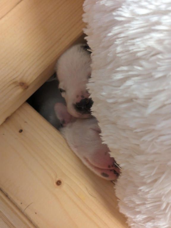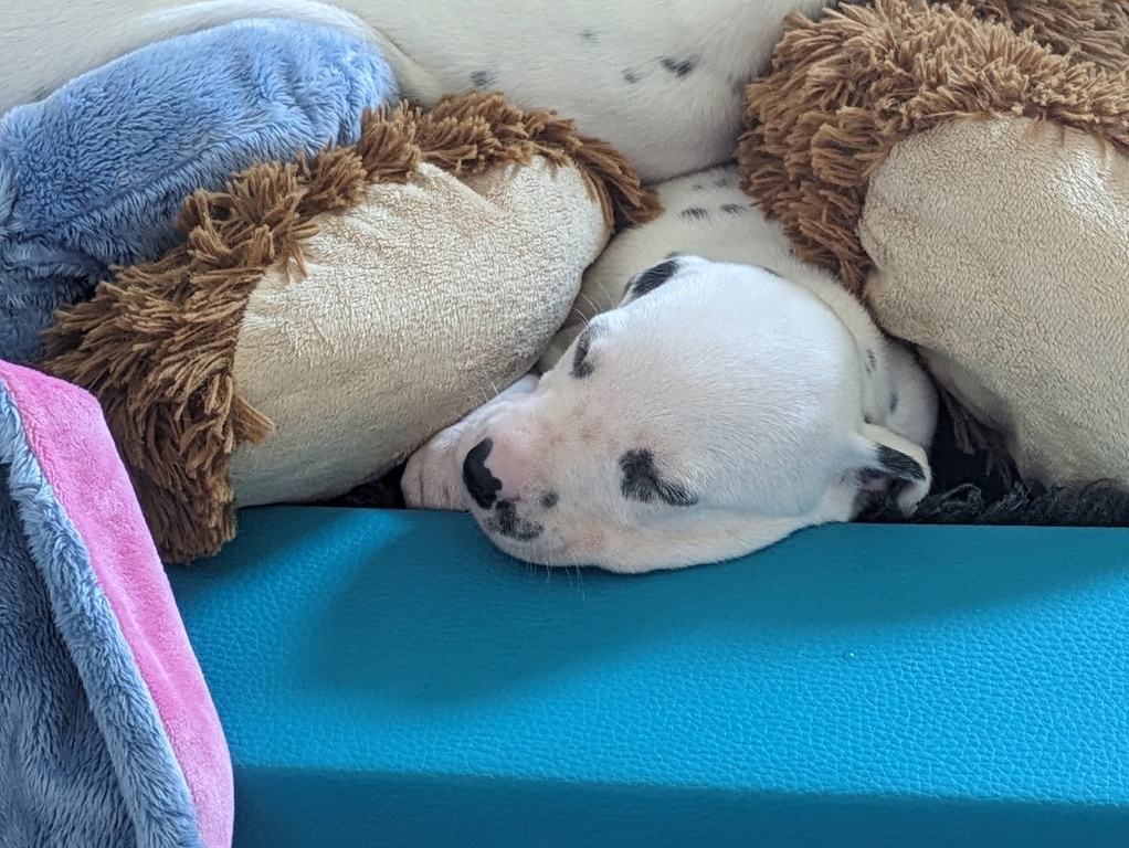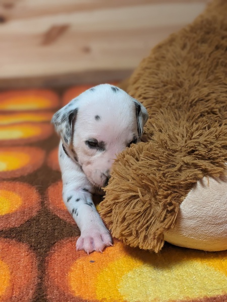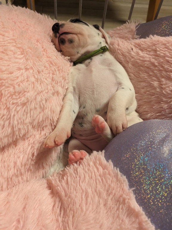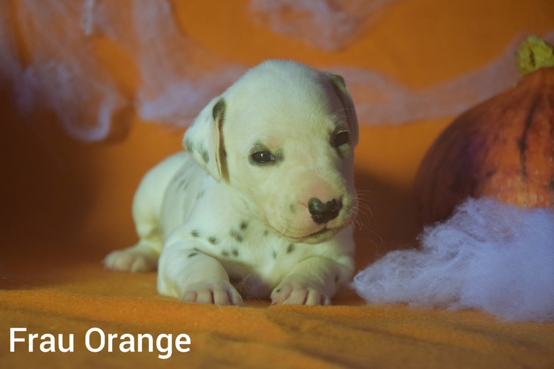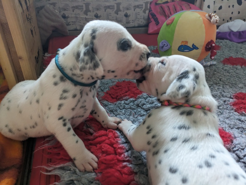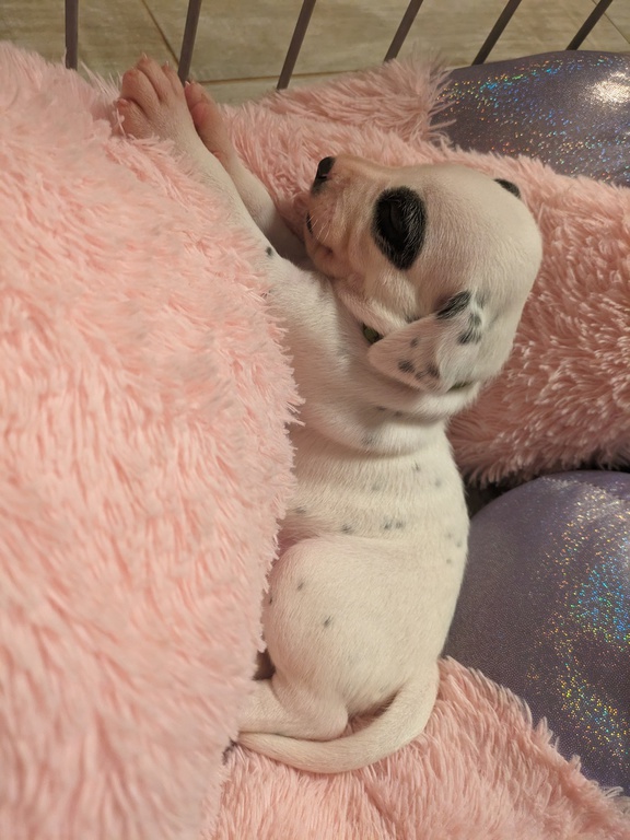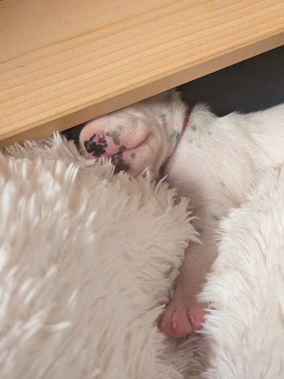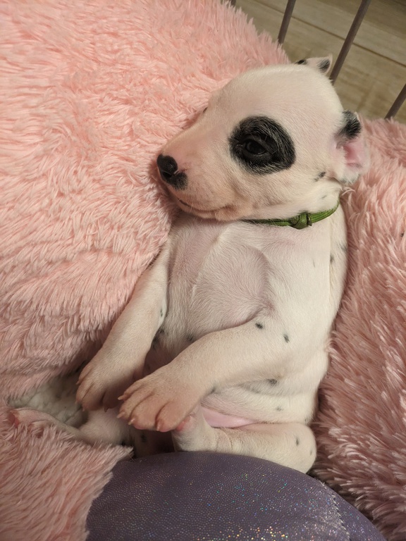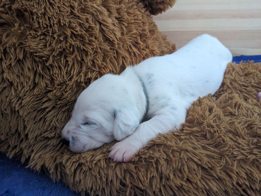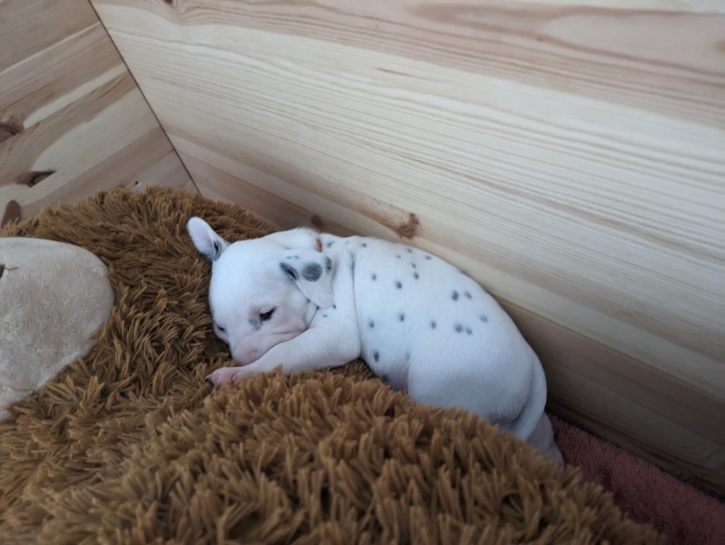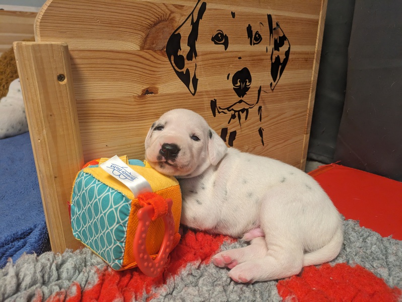 Die Pünktchen Bande nimmt gut zu, damit sind wir völlig zufrieden. Die Schlafensphansen sind auch schon etwas länger, jedoch ist dann richtig Party wenn alle wach sind und an die Milchbar wollen. Die ersten Äuglein sind schon auf. Herr Schwarz war hier der Erste, er ist insgesamt relativ flott, auch beim laufen und erkunden. Frau Gelb, Frau Oliv, Frau Orange und Herr Petrol haben ebenfalls die Augen offen. Die restlichen 5 lassen sich noch etwas Zeit damit, sie wollen wohl noch nicht die Welt sehen. Trotzdem sind sie alle schon recht gut auf ihren Beinchen unterwegs und die ganze Wurfbox wird erkundet. Ist mal kein Spielzeug in der Box, so finden sie das überhaupt nicht gut, schließlich wollen sie auf die Kuscheltiere drauf klettern oder sich darunter verstecken zum schlafen. Zur Not müssen halt die Geschwister her halten und werden als Kopfkissen benutzt. Es wird auch schon fleißig am Geschwisterchen herum gekanabbert und auch an Mama Ami. Es wird sich schon hingesetzt wie ein Großer und auch die Bellversuche werden immer besser. Das Körbchen reicht nun auch nicht mehr aus und so sind wir auf eine Faltbox umgestiegen, dies fanden sie am ersten Tag allerdings nicht so lustig und Herr Petrol hat dies auch laut verkündet und fleißig gebellt. Dies hört sich natürlich aktuell alles noch sehr lustig an. Nach kurzer Zeit, fanden es aber alle in Ordnung und haben sich friedlich ineinander gekuschelt und geschlafen. Auch der Distanzrahmen ist abgekommen, denn da passen sie nicht mehr drunter und so ist gefühlt auch etwas mehr Platz in der Box.