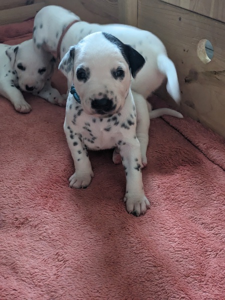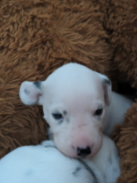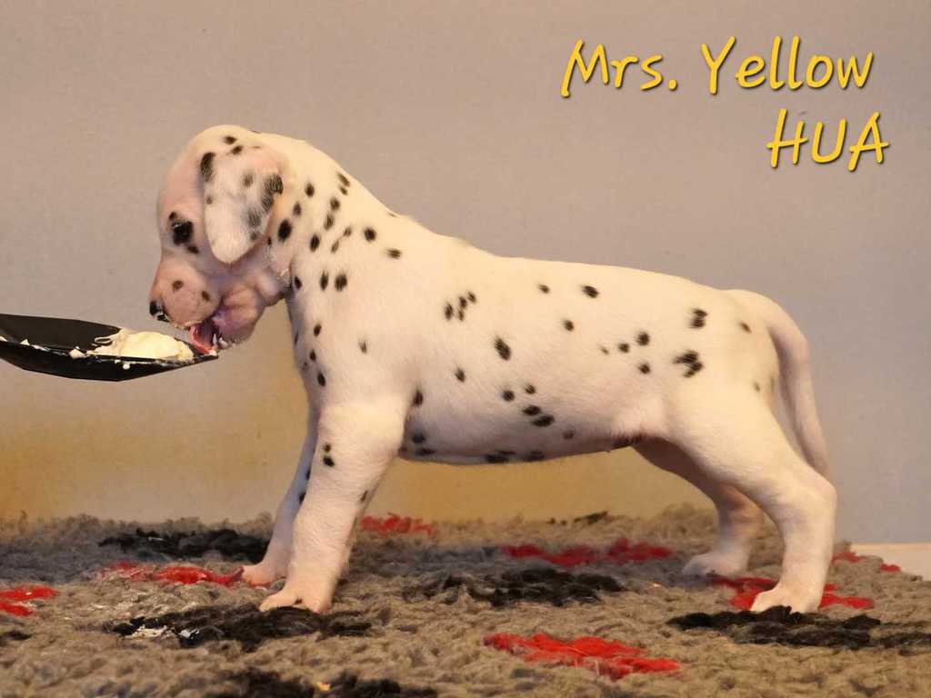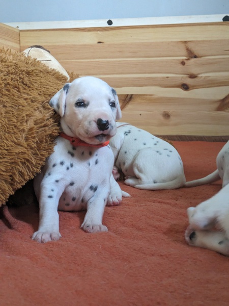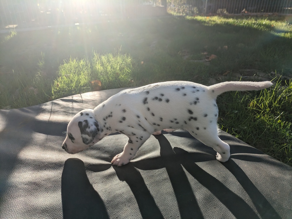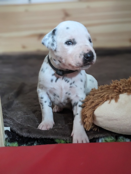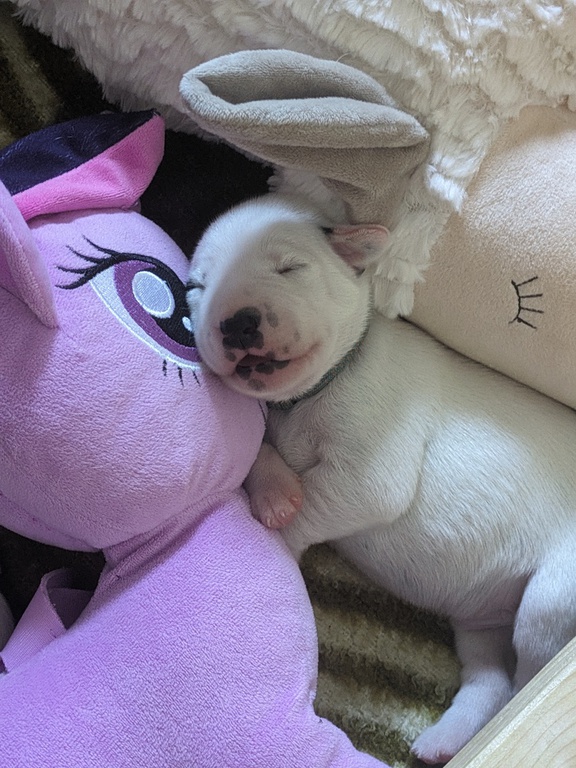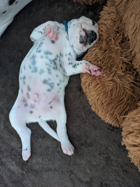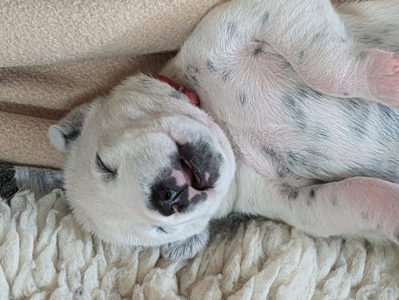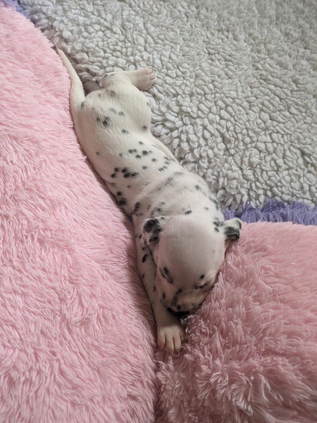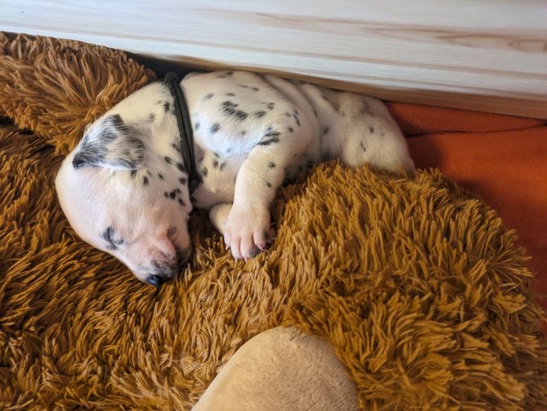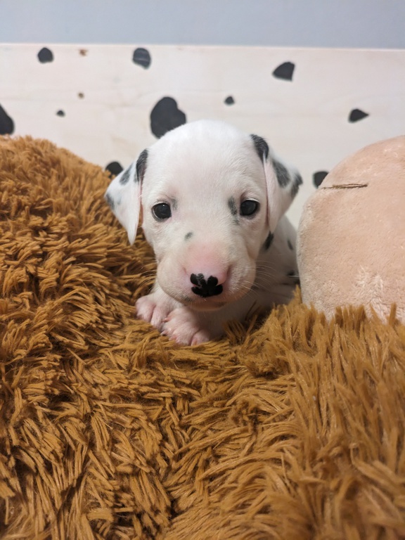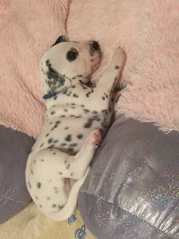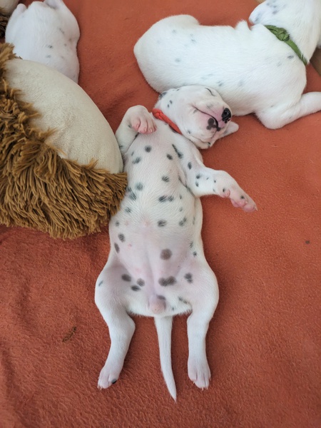 Die Pünktchen Bande nimmt gut zu, damit sind wir völlig zufrieden. Die Schlafensphansen sind auch schon etwas länger, jedoch ist dann richtig Party wenn alle wach sind und an die Milchbar wollen. Die ersten Äuglein sind schon auf. Herr Schwarz war hier der Erste, er ist insgesamt relativ flott, auch beim laufen und erkunden. Frau Gelb, Frau Oliv, Frau Orange und Herr Petrol haben ebenfalls die Augen offen. Die restlichen 5 lassen sich noch etwas Zeit damit, sie wollen wohl noch nicht die Welt sehen. Trotzdem sind sie alle schon recht gut auf ihren Beinchen unterwegs und die ganze Wurfbox wird erkundet. Ist mal kein Spielzeug in der Box, so finden sie das überhaupt nicht gut, schließlich wollen sie auf die Kuscheltiere drauf klettern oder sich darunter verstecken zum schlafen. Zur Not müssen halt die Geschwister her halten und werden als Kopfkissen benutzt. Es wird auch schon fleißig am Geschwisterchen herum gekanabbert und auch an Mama Ami. Es wird sich schon hingesetzt wie ein Großer und auch die Bellversuche werden immer besser. Das Körbchen reicht nun auch nicht mehr aus und so sind wir auf eine Faltbox umgestiegen, dies fanden sie am ersten Tag allerdings nicht so lustig und Herr Petrol hat dies auch laut verkündet und fleißig gebellt. Dies hört sich natürlich aktuell alles noch sehr lustig an. Nach kurzer Zeit, fanden es aber alle in Ordnung und haben sich friedlich ineinander gekuschelt und geschlafen. Auch der Distanzrahmen ist abgekommen, denn da passen sie nicht mehr drunter und so ist gefühlt auch etwas mehr Platz in der Box.