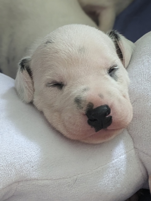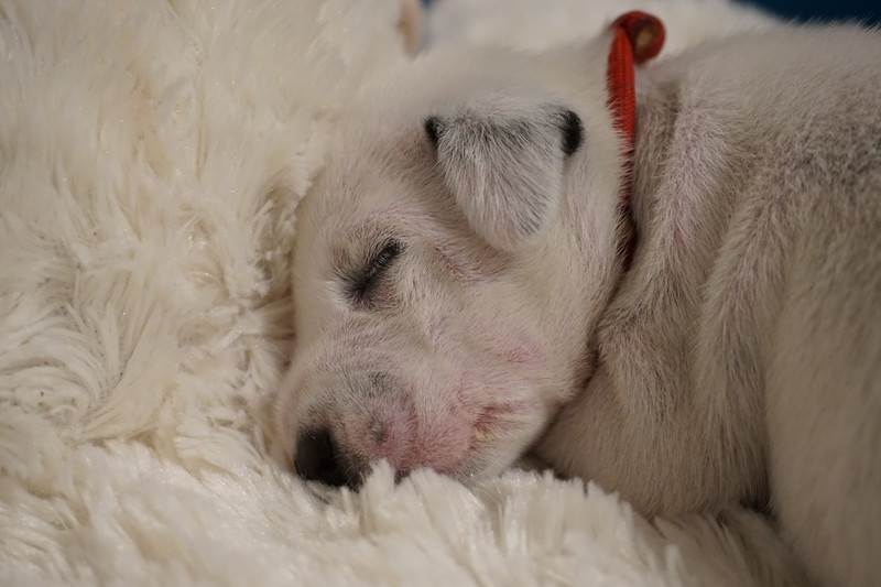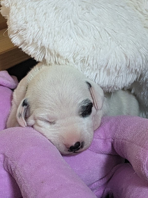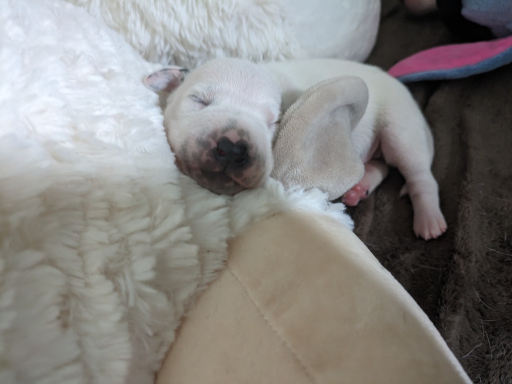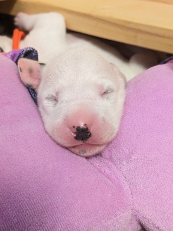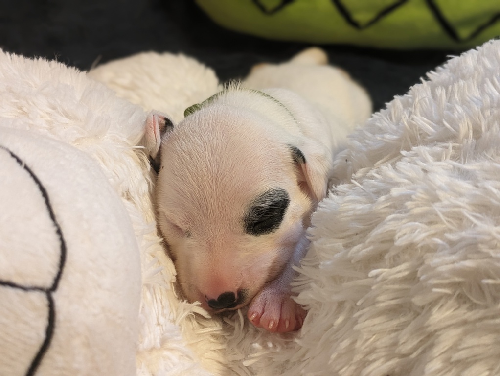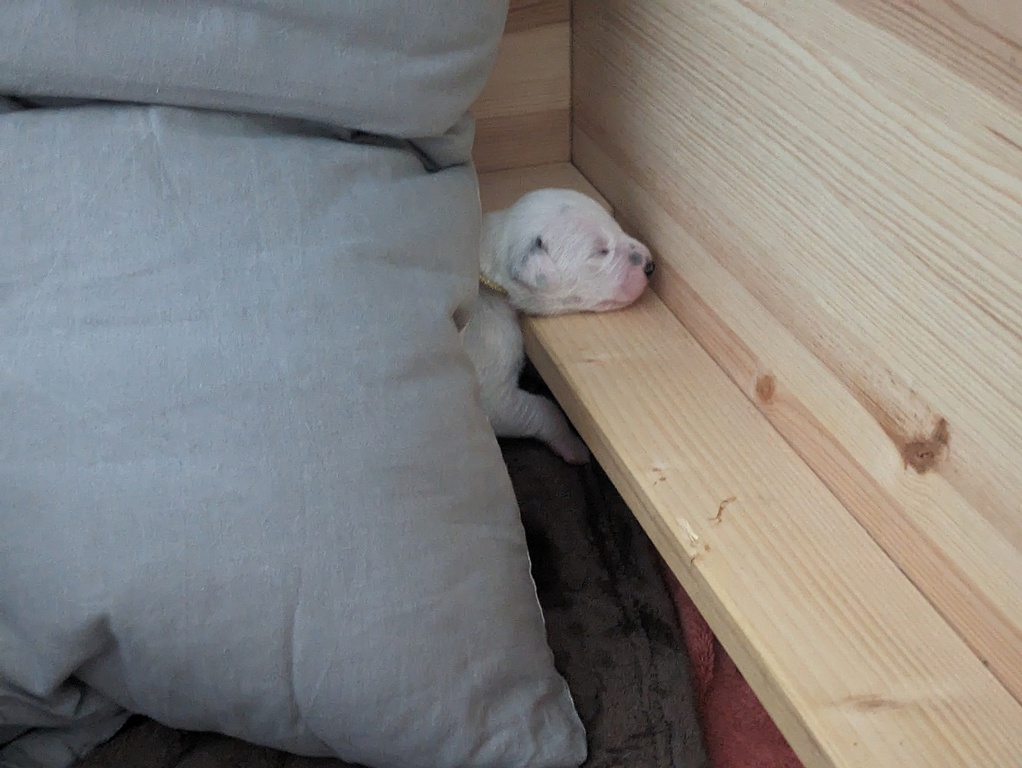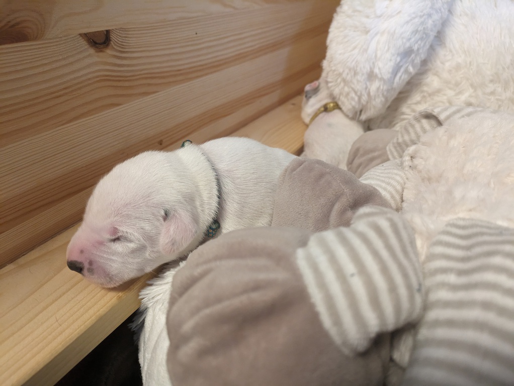 Nun ist schon die 1. Woche vorbei, man kann es gar nicht glauben wie schnell eine Woche verfliegt. In der Wurfkiste tut sich schon einiges. Es ist fazinierend wie sich die kleine Pünktchen entwickeln. Von Tag zu Tag ändert sich was an ihnen. Die Punkte kommen immer mehr durch, sie bewegen sich schon viel mehr und versuchen ihre Beinchen richtig zu benutzen. Ich glaube wir bekommen kleine Bergsteiger, denn es muss immer versucht werden auf das Kuscheltier drauf zu kommen. Es wird schon gegähnt, geträumt und auch die Geräusche werden immer lauter. Die ersten Bellversuche kann man schon hören, wenn auch noch etwas merkwürdig. Es wird schon ordentlich gemeckert, wenn man die Mama nicht gleich findet. Die Schlafensphasen sind auch schon länger als am Anfang. Nun kann Ami auch mal für gute 90 Minuten sich vor die Wurfbox legen und dort erholen, auch wenn sie es oft nicht sehen kann wenn die Kleinen schlafen, so weckt sie sie doch gerne und muss sie dann putzen und dann wollen sie natürlich auch an die Milchbar.