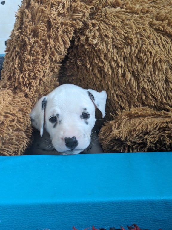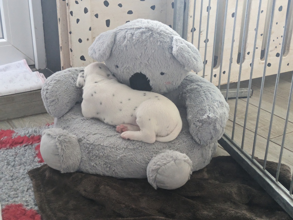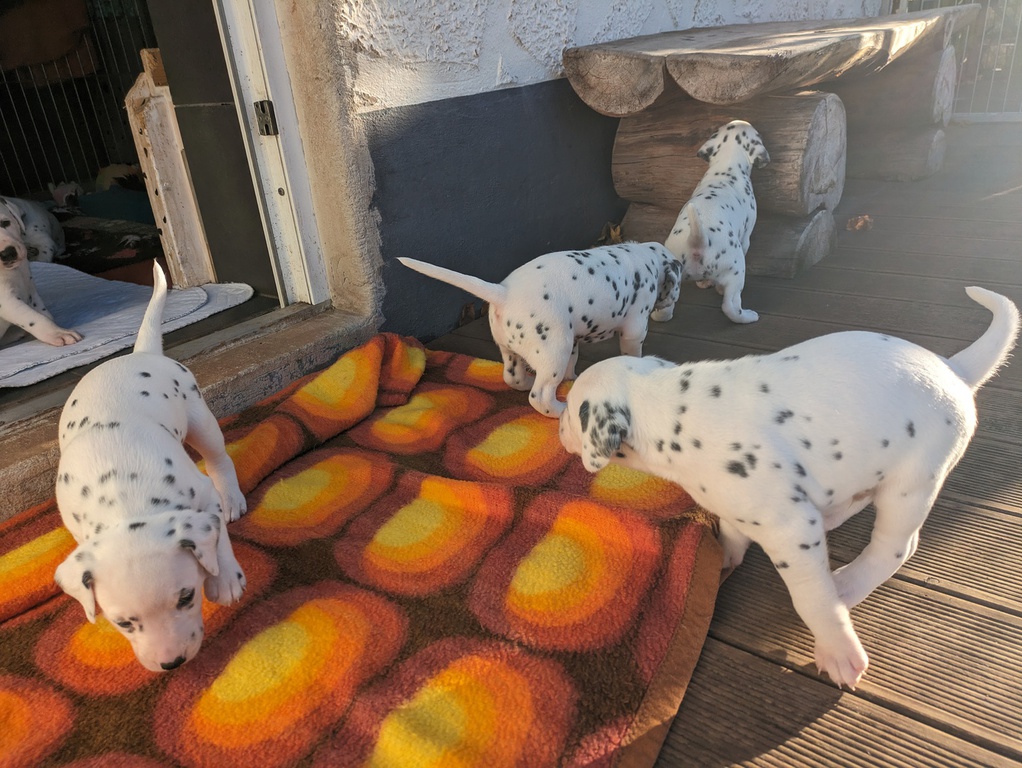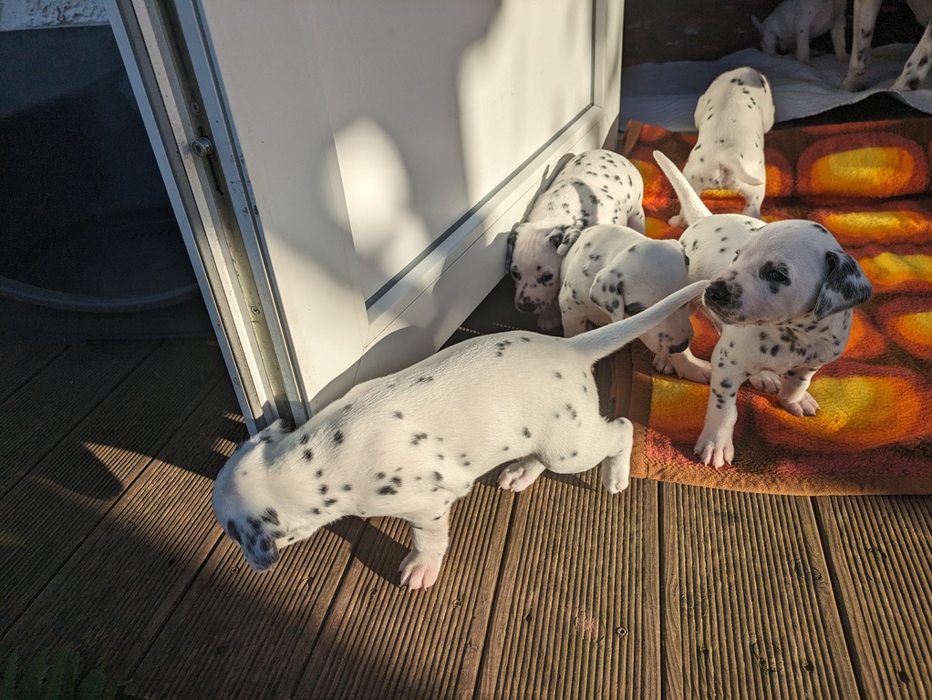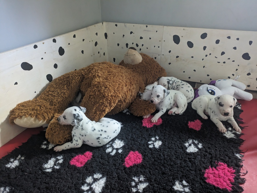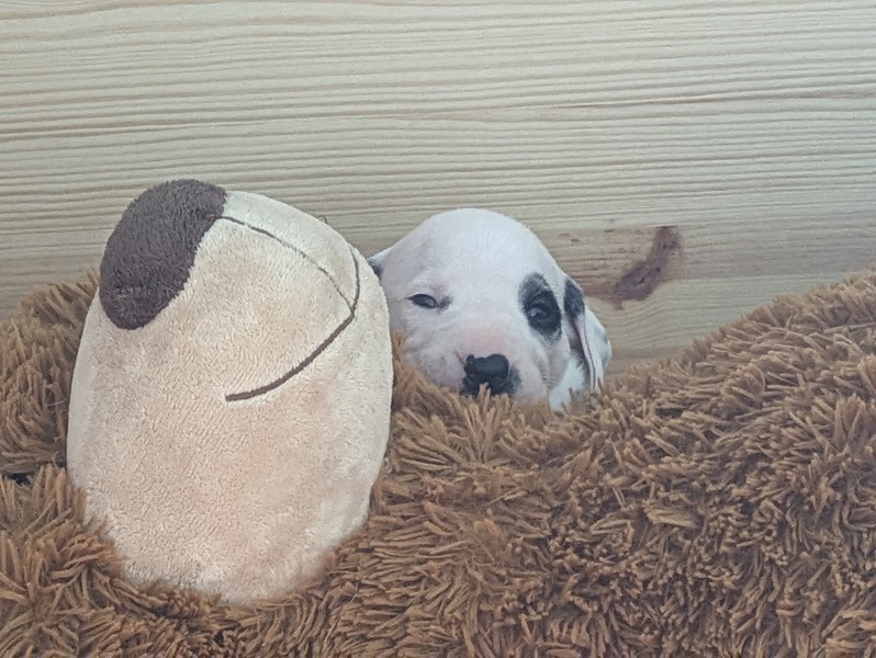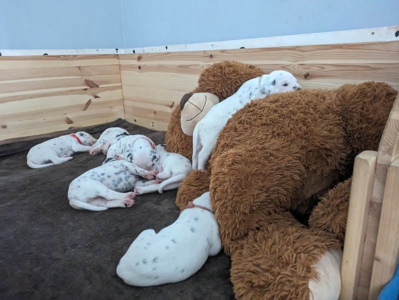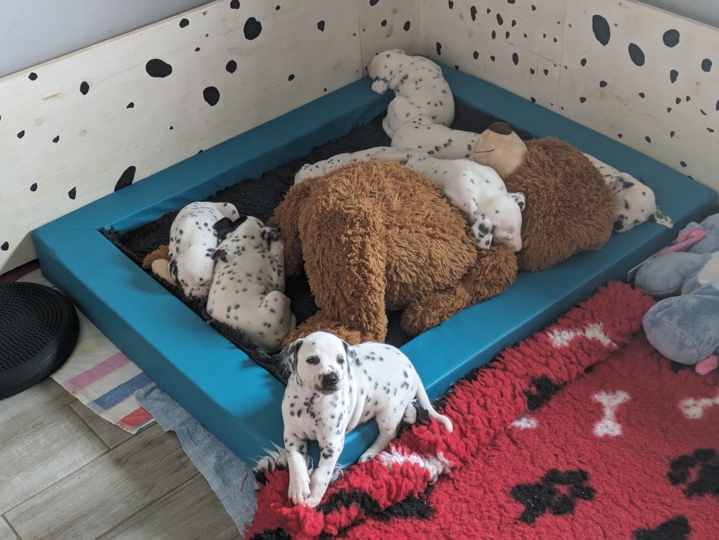 Zum Wochenwechsel wurde erst einmal die Wurfkiste abgebaut. Sie wurde nicht mehr all zu viel genutzt und wir wollten mehr Platz haben um ihnen neues zeigen zu können. Beim Abbau haben die kleinen Pünktchen ganz neugierig zugeschaut und der ein oder andere hat sich auch ganz Nah an den Akku Schrauber getraut, richtig mutig. Also die Wurfksite dann weg war, war es doch anfangs komisch für sie komisch, aber das legte sich ruckzuck. Hauptsache ihr Teddybär ist noch da, denn diesen lieben sie über alles. Er ist nämlich so toll zum kuscheln, zum klettern und um sich darunter zu verstecken. Sie haben ein Hundebett bekommen und vorne dran eine große Matratze mit Vetbed. Nach und nach sind neue Spielsachen dazugekommen. Ein Ball, ein Würfel, ein Auto welches Geräusche macht. All dies ist völlig normal für sie. Balancekissen und Wackelbrett werden ohne Probleme benutzt.