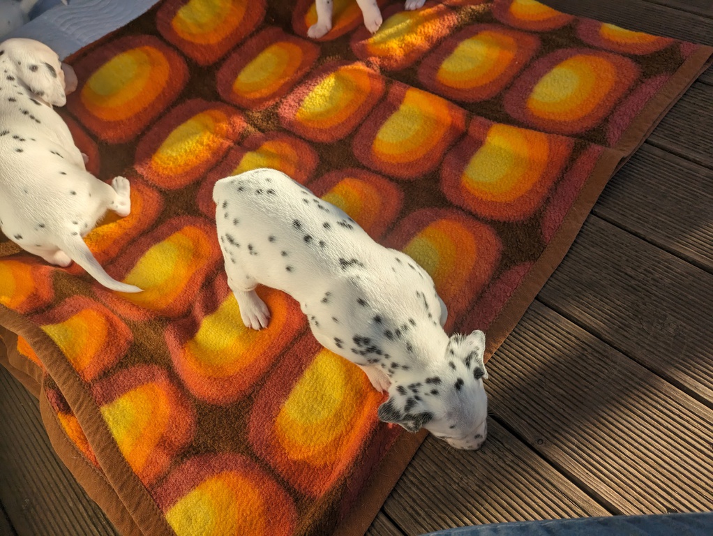 Coppers Frauchen hat uns auch besucht, worüber wir uns sehr gefreut haben. Wir haben die ersten Standbilder versucht zu machen. Sie sind dafür noch zu jung eigentlich, aber sie haben es schon toll gemacht. Auch Lucia war von den Pünktchen begeistert.